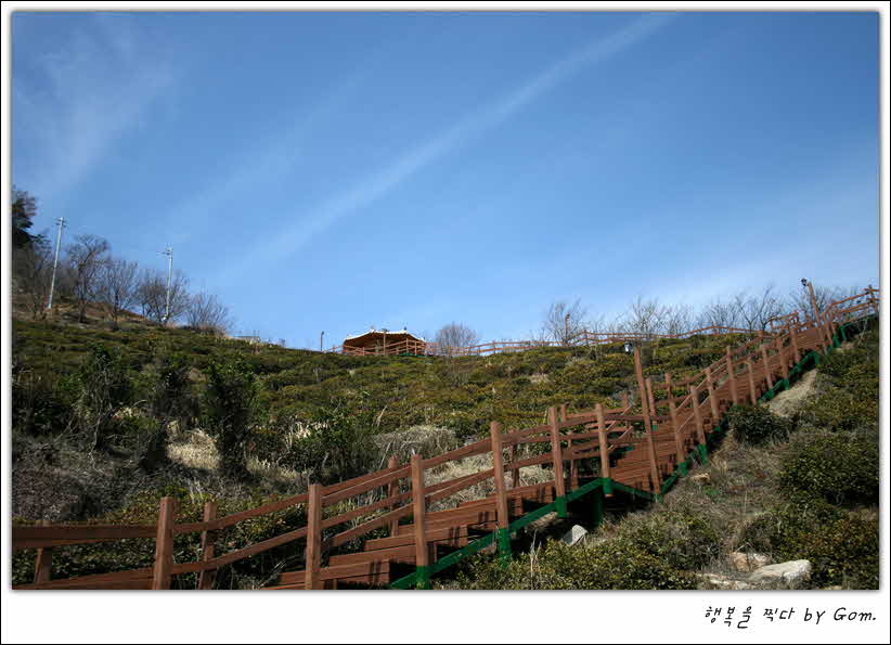 그 곳 꼭대기에 있는 정자입니다. 그곳에는 녹차 무료 시음! 차 드신 후 청결! 이라고 붙어 있던데... 드신 분들이 정리를 안 하신 것인지... 주인 아저씨가 바빠서 정리를 안 했는지 차를 마실 수 있는 준비가 안되어있습니다. ^^* 하지만, 풍경은 멋죠. |