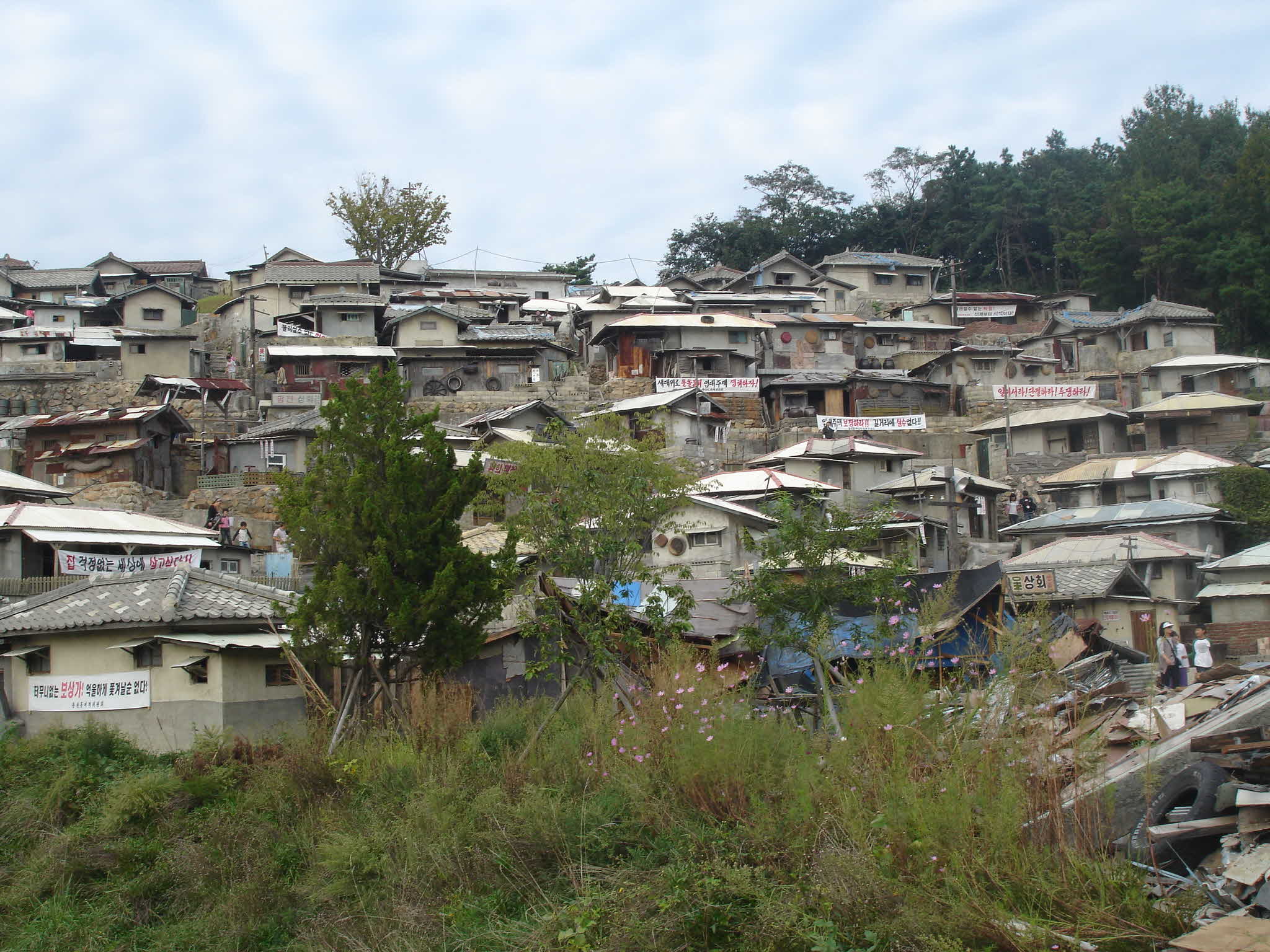 널려져 있고 양철 지붕이 날라갈라 구멍난 알루미늄 다라들이 지붕위에 얹혀져 있다..