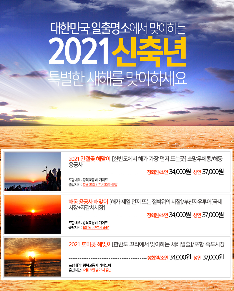 제목 ★2021 신축년 신년 해맞이여행★ 대한민국 해맞이 명소에서 새해소원 빌어보세요~ 등록일 20.11.17 조회 5,000