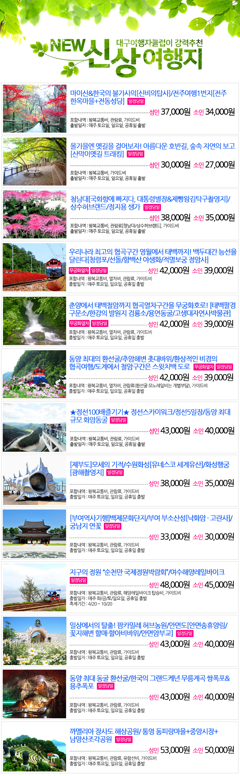 제목 대구여행자클럽이 강력추천!!! ★ 따끈따끈한 신상여행지★ 등록일 13.10.11 조회 2,066