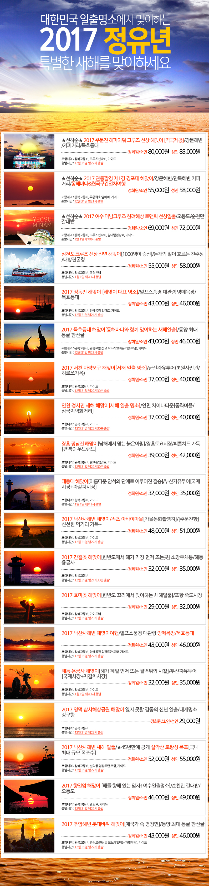 제목 ★2017 정유년 신년 해맞이여행★ 대한민국 해맞이 명소에서 새해소원 빌어보세요~ 등록일 16.11.22 조회 6,944