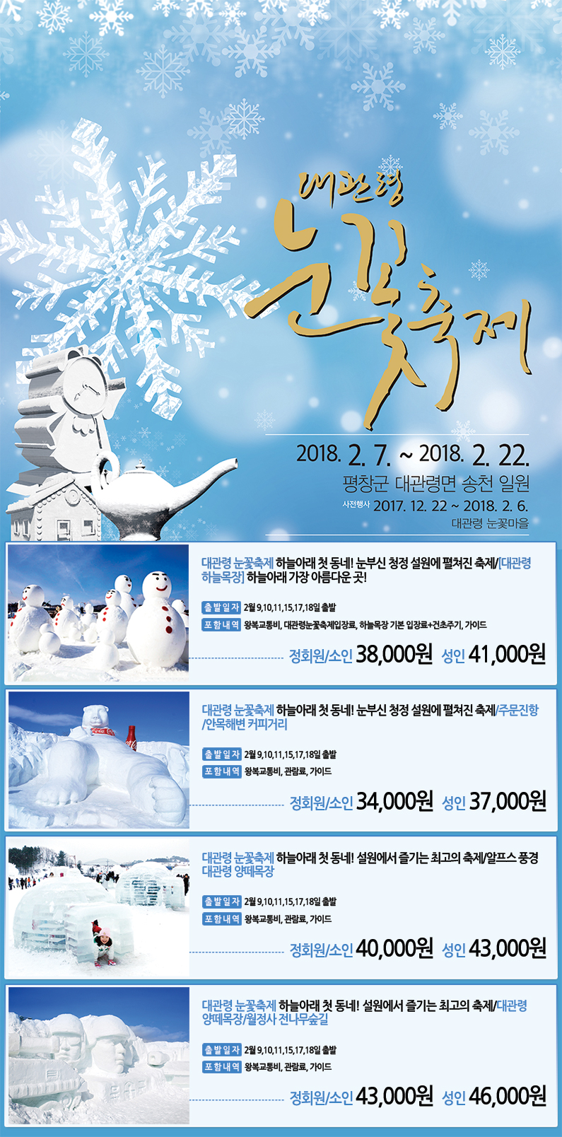 제목 [대관령 눈꽃축제] 눈부신 순백세상♡설원에서 즐기는 최고의 축제 등록일 18.01.31 조회 1,841
