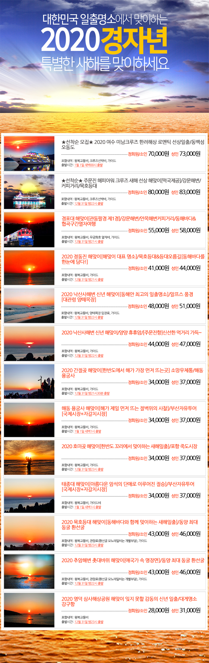 제목 ★2020 경자년 신년 해맞이여행★ 대한민국 해맞이 명소에서 새해소원 빌어보세요~ 등록일 19.11.14 조회 1,643
