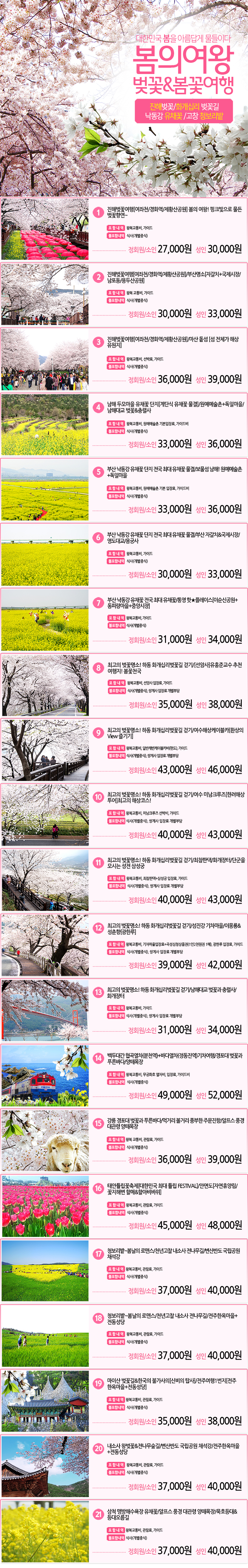 제목 2020 봄의여왕 벚꽃&봄꽃여행 ♥ 진해벚꽃/화개십리벚꽃길/낙동강유채꽃축제/고창 청보리밭 등록일 20.02.29 조회 1,227
