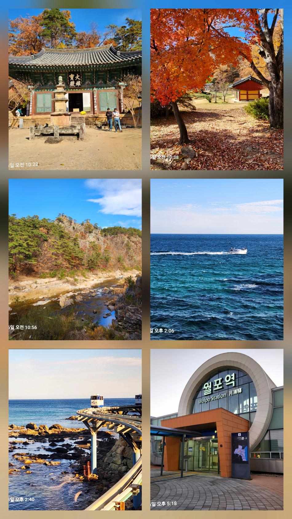 사찰로 들어가는 길이 불영계곡이라 멋진 트레킹! 와우!불영사에 도착하니 가을이 내려앉아 있었다. 거북이 두마리, 석탑부처와 연못에 비친 부처도 보고 예쁘게 물든 단풍을 배경으로 추억도 남기고 죽변항으로 가서 해물라면으로 맛있게 점심을 먹고 해안스카이레일에 탑승해서 새하얀 파도가 일렁이는 옥빛 동해를 바라보며 왕복으로 다녀왔다. 굿굿굿!!!! 마지막으로 죽변역으로 이동하여 월포역까지 1시간 30분의 기차여행! 창밖을 구경하다가 어느새 잠이 들었는지.....꿀잠을 잘 잤다. 월포역이라 내려서 귀가행 버스로~~~ 송민정 가이드님, 친절한 가이드 감사합니다. 대구여행자클럽, 브라보!!!