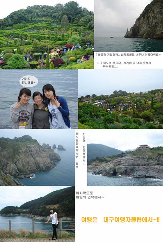 전날부터 대구에는 꽤 많은 양의 비가와서 계속 걱정했었는데 당일아침엔 비가안왔지만 거제도에 도착하니 보슬비가 조금씩 내리더라구요.. 다행히 많이 오지 않고 시원한 바람과 구름에 해가 가려 오히려 여행을 즐기기에는 이런 날씨가 더 나은거 같다는 생각도 들었습니다. 여행생각에 입맛이 도는지 아침부터 싼 도시락은 관광버스가 출발하기도 전에 배가고파 다 먹어버리고 그랬네요ㅋ 그렇게 외도에 다다르니 역시 황금연휴 답게 외도에는 사람들로 미어터졌습니다. 한시간 반이라는 제한된 시간안에 외도를 느끼기에는 외도는 너무 멋진곳이어서 조금 아쉬웠습니다. 계절이 바뀔때마다 외도에 온다면 더더욱 좋겠다는 생각도 들었구요. 역시 거제도의 지중해라는 말이 괜히 있는게 아니더군요. 축 늘어진 야자수와 다양한 품종의 선인장들과 엄청나게 큰 알로에들.. 외도의 입구에서부터 정말 외국에 온 기분이었습니다. 아직 봄이 끝나지않음을 알리는 예쁜 꽃들과 외도의 아기자기한 시설들은 사진찍기에 좋고요, 특히나 나무조경이 기억에 많이 남네요. 다음은 몽돌해수욕장에서 점심을 먼저 먹었습니다. 기사님과 가이드언니가 추천해주신 식당에서 해물된장찌개 먹었습니다. 가까이 바다가 보이는 곳에서 해물이 가득한 된장찌개를 먹으니 밥이 절로 넘어가더군요. 그렇게 점심을 먹고 몽돌해변을 맨발로 걸어다니니까 지압도 되고 시원한 바닷물에 발도 담그고ㅋ 외도에서는 사람이 많아 정신없었는데 해변에서는 가이드언니가 사진도 많이 찍어주시고 재밌게 휴식을 취했습니다. |