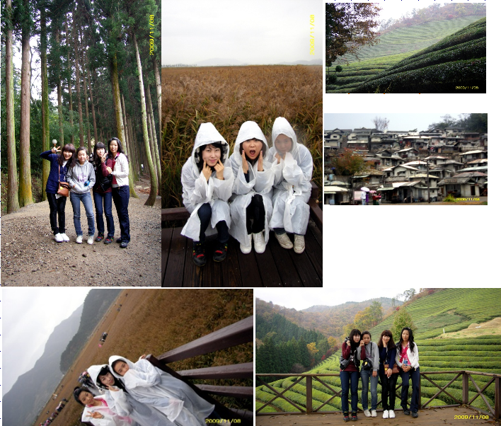 그런데 여행가기전 날씨를 체크하던 중 비가 온다는 말에 울컥하는 느낌이었다. 여행을 가도 날씨가 너무 좋아 탈이었는데 이번엔 너무 안좋아 탈이었다..이런이런..좌절했지만 절대로 포기할수 었었으므로 날씨랑은 잠시 안녕하구,출발지인 신세계로 고고고고~ 버스타고 가는 중에 비가 내리길래 아..끝났다!!라고 생각했는데 신세계에 오니 비는 잠시 소강상태..ㅋ 그리고 드디어 사람들이 모이고 버스가 출발했다. 버스가 씽씽~출발하는데 예상보다 늦어진 출발이라 제시간에 도착하는 것이 관건이었다. 씽씽~쌩쌩~오늘은 다른차들도 많고,,휴게소는 터져나가고..화장실은 못가고..와우!! 그러다 어느정도 내려가니 햇살이 살짝꿍 반겨주길래 날씨 좋다!!라고 친구들과 말했는데 완걸..조금더 가니 와장창 내리다 못해 쿠쿠쿠쿵 쏟아지더니 앞이 안보여..이런 그래도 한편으로는 날씨 좋아져라고 빌고 빌면서 잠을 잤다. 잠자는 사이 도착한 보성녹차밭중 가장 큰 대한다원에 도착했다. 와..삼나무가 우리를 반겨주듯 쭉쭉 뻗어있는 길따라 사진도 찍고 이야기도 하고 비는 우리소원 들어준듯 내리지 않고 기분도 업이 되어 사진을 왕창 찍으면서 올라가던중 녹차밭을 보고 우와~잎이 쩍 벌어졌다. 크진 않지만 그렇다고 작지도 않는 녹차밭을 보면서 사진찍는다고 우리들은 정신이 없고~가파른 녹차밭을 걸어다니면서 구경삼매경에 빠지고 다음 목적지인 낙안읍성에 갔다. 낙압읍성은 규모가 가장 큰..옛모습 그대로 보존된 읍성은 멋졌지만 배가 고파 우선은 밥을 먹으러 갔다. 오늘의 하이라이트는 역시 머니머니 해도 순천만 갈대밭이었다. 마지막인 에덴의동쪽 세트장에 도착!! |