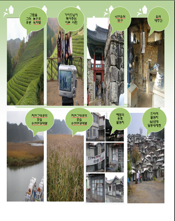 일주일 전부터 남은 날들을 손가락 세가며 기다렸던 11/8일 여행날 여느때와 다름없이 새벽 5시에 일어나 이쁘게 화장하고 신세계 웨딩홀 버스 타는 대로 출발하였다. 너무 일찍 도착한 탓인지 두 번째로 버스에 탑승해 얼릉 뒷 자석으로 뛰어가 자리를 잡았다. 출발시간이 6시 30분이지만 지각을 한 친구 때문에 약간 시간이 지체 되어 많은 사람들에게 죄송한 마음을 가지고 전라남도 보성으로 출발하였다. 남해고속도로 휴게소에 들러 핫바 한 개로 굶주렸던 배를 조금이나마 채우며 그렇게 몇 시간을 달려 보성 녹차 밭에 도착하였다. 녹차 밭에 도착하여 내리자마자 우리를 반긴 건 곧으면서 날씬하게 자란 삼나무 였다. 나무 사이사이에 자란 짙은 초록빛을 지닌 이끼도 한번 만져 보고 사람손이 거친 것 같은 매끈한 나무도 한번 만져 보며 우리는 녹차밭 으로 올 갔다. 가이드님 말씀처럼 그렇게 크지는 않지만 초록색 물감으로 그림을 그려 놓은 듯한 마치 계단 같은 녹차 밭이 펼쳐져 있었다. 녹차 잎을 따는 시기를 지나 두꺼워진 잎을 만져 보고 약간의 더위를 식혀 줄 녹차 아이스크림도 먹었다. 녹차 밭을 뒤로 한 채 몇 십 분을 달려 도착한 낙안읍성! 그렇게 낙안읍성을 뒤로 한 채 순천만갈대밭으로 향했다. 비가 오락가락하고 흐린 날씨 속에서도 여행을 온 사람들로 북적북적 거렸다. 버스를 내리자마자 쏟아지는 비 때문에 우의를 입고 구경을 했다. 많은 사람들 속에 끼어 사람얼굴을 닮은 조롱박이 달린 조롱박 터널을 지나 갈대숲이 펼쳐진 곳으로 갔다. 내 키보다 더 크게 자란 갈대들이 나풀나풀 바람에 흩날리고 있었다. 갈대사이사이에는 숨어 있다 개구리들이 나와 우리를 반겨 주곤 했다. 얼마 가지 않아 도착한 드라마 촬영지! 여기는 에덴의 동쪽과 여러 드라마, 영화촬영지로 유명하였다. 들어서자마자 실제 지금 살고 있는 집이라고 해도 믿을 만큼 잘 지어진 건물이 빼곡히 서 있었다. 소품 하나하나가 정성들여 만들어 졌다 는게 느껴졌다. 이번여행에서도 아름다운 풍경을 사진 속에 담기 위해 열심히 뛰어 다녔다. 몇 년 뒤 아니 몇 달 뒤에 사진을 보며 행복해 하고, 미소를 머금을 내 모습을 떠올리며..... |