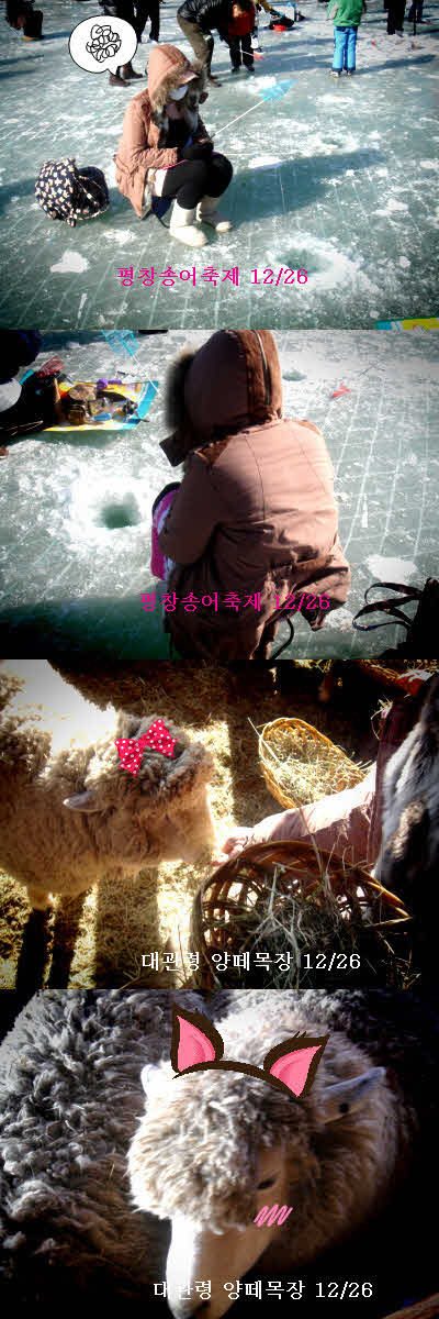 일단 가이드님 너무 친절하시고 재미있으셔서 여행이 2배는 더 즐거웠던것 같아요! 수고하셨어요~^^ 확실히.강원도 춥더군요. 대구와는 비교도 안됐던..ㅎ 손끝발끝 다 터지는지 알앗다규효..ㅎㅎ 일단 송어축제장 도착해서 넘치는 의욕가지고 가이드님 알려주신데로 정성들여 낚시대 아래위로 움직여가며 집중했지만... 10마리는 잡겟다던 의지는 사라지고 1마리라도 잡으려고 했지만. 역시나..안되더군요 ㅎㅎ 옆에서는 자꾸 환호성 터져나오는데 저는 한숨만..ㅎㅎ 부러워서 구경만..송어가 우리만 피해가는것같았다는 ㅋㅋ 음식 엄청 비쌀줄알고 도시락 싸갓는데 판매되는 음식너무 저렴하고 맛있는게 너무너무 많아서 도시락사온걸 후회햇지요.. 송어잡이는 미련 버리고 눈썰매 타러갓는데 ㅎㅎ 왠걸.. ㅎㅎ송어잡이보다 더더더더더 재미잇엇어요ㅎㅎ 경사가 심해서 타고 내려가는데 심장이 튀어나갓다가 다시들어오는줄 ㅋㅋ 이제까지 탔던 눈썰매중에 쵝오였어요! 눈썰매 또타고 싶네요 ㅋㅋ 양떼목장에서는 가이드님 말씀대로 정말 만화에 나오는 새하얀 양은 없었어요 꾸정물뒤집어쓴 양만 잇엇어요 ㅎㅎㅎ 건초 주니깐 계속 먹고 양의 탈을 쓴 돼지가 아닐까...의심도 했어요 ㅋㅋ 낼름낼름 잘받아먹더라구요 ㅎ 목장도 한바퀴돌고 사진도 찍고. 따뜻할때 오면 더 좋을 것 같더라구요 1월에 산천어나 빙어축제에도 가서 꼭 낚아볼려고 마음먹고 있습니다 ㅎㅎ