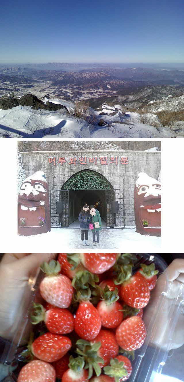 저희 여행의 시작은 설레임보다는 일상의 지친마음을 자연과 함께해서 치유하고 싶은 마음이 컸습니다~^_^ 12월중순에 일에 지친 친구와 딸기가 먹고싶다고 징징거리는 친구를 보면서 아 어디든지 가까운데로 떠나고 싶다는 생각이 굴뚝같았습니다. 그런데 연말이라 바쁘고 일때문에 바쁘고 그러다 보니 1월16일이라는 공통된 날짜가 나오더군요. 12월중순에 2010년 1월16일이란 날짜의 여행목록을 확인하다보니 앗! 이거구나~ 싶은게 있더군요. <무주설천동 눈꽃트래킹 & 머루와인 & 딸기따기체험> 꺄오~~~~ >▽< 조금 이른거 같았지만 그래도 예약자가 너무 많아서 우리 자리가 없으면 어떻게하나라는 초조한 마음에 급히 3명예약을 했죠~ 꺄르르르르 드디어 떠나는구나 싶었지만! 아직 한달이나 남았다는거!ㅋㅋㅋㅋㅋ 다음주되니 여행확정이니 얼른 입금하라는 문자가 오더군요. 그래서 또 초조한 마음에 친구들을 독촉해서 잽싸게 돈을 송금하고 이제 편한 마음으로 보름정도 남은 무주여행을 기다렸습니다. 딸기먹고 싶다고징징거리던 친구(이하 딸기친구)도 일에 지쳐서 너무 힘들어하는 친구(이하 일친구)도 나의 탁월한 선택에 모두들 눈물퐁퐁 감동에 휩싸일꺼라는 생각에 흐뭇해 하며 여행의 그날만을 기다리고있었습니다!ㅎㅎ 드디어 다가온 16일 새벽!ㅋ 평소보다 10분정도 먼저 동아쇼핑에 도착해서 기다리고있었습니다. 그런데 딸기친구가 전화도 받지 않고 오지도 않는겁니다.T_T 초조해하는 저와 달리 딸기친구의 전화는 컬러링도 없이 그냥 통화음만 나오더군요~ 에잇! 가이드님께 딸기친구가 안온다고 말씀드리고선 성서홈플로 고고고~~~ 성서홈플에서 일친구가 타고 나니 이제 정말 무주로 향했습니다. 딸기친구가 오지 않았다는 사실에 처음에는 "어떻해 하냐? 딸기친구가 전화를 안받을 친구는 아니다. 무슨 일이 있는거 아니냐!" 이러면서 걱정을 했지만 점점 무거워진 눈꺼풀과 별일없으니 연락이 없는거다 라는 생각에 무주에 도착하기전에 버스에서 달콤한 새벽잠을 잤습니다~꺄오~!ㅋ 잠도 덜깬채 부시시하게 도착한 곳이 무주리조트~ㅋ 대충 어기적 어기적 거리면서 일친구의 이야기를 들으면서 가이드님께 곤돌라 왕복표를 받아서 곤도라를 타러 갔습니다. 오웃! 제 잠을 확 깨운 등산맨 아줌마, 아저씨들~ㅋㅋㅋㅋ 산악회에 뒤진다면 아마 1시간뒤에나 곤도라를 탈 수 있을꺼 같아서 그 사이를 무작정 비집고 친구와 앞으로 냅따 달렸습니다~ㅋㅋㅋ 어떻게든 빨리 탈려고...ㅋ 다행이 산악회는 질서정연하게 줄을 서고 있길래 잽싸게 곤도라 탑승!ㅋ 꺄오~~~~ 잠도 깨고 대구에서는 보기 힘든 스키장의 하얀눈들을 보면서 살짝 몰려오는 멀미증상과 함께 점점 곤도라는 높이높이 올라갔습니다. 정말 못참겠다고 토하고 싶을때 쯤에 도착한 정상에서 바깥의 차디찬 공기를 들이마시고선 다시 일반인으로 돌아왔습니다.ㅋㅋ 어디로 어떻게 가야하는지도 모르면서 보드타는 사람들 스키타는 사람들 몇몇 산악회사람들 그리고 왠지 같은 버스를 타고 오신듯한 사람들 사이를 이리저리 걷다가 설천봉으로 가는 길 발견!ㅋ 아~~~~ 그런데 너무 추워서 고개를 들기 싫어서 후드눌러쓰고 목도리로 칭칭감고 고개 푹숙이고 그렇게 설천봉으로 향했습니다. 너무 춥고 장갑을 꼈는데도 손은 시리고 발은 이미 감각이 없고... 더이상올라가기 싫다고 생각했는데... 그래도 정상은 가봐야지 싶어서 또 고개 숙이고 걷고 걷고 또걸어서 정상에 도착했습니다. 우와~~~~~~~ 완전 눈덮힌 산이며 매서운 바람이며 도저히 눈을 제대로 뜨고 볼 수가 없더군요~ㅋㅋㅋ 오늘 분명 날씨가 따뜻하다 해서 대구날씨만 생각하고 중무장하지 않았는데...ㅋㅋㅋㅋㅋ 너무 추워서 제대로 보지도 못하고~ㅋ 생각해보니 오면서도 고개 좀 들었다면 좀더 이쁜 눈꽃을 봤을꺼 같은데... 추워서 너무 움크리다보니 너무 좋은풍경들을 못봐서 많이 아쉬웠습니다. 아무생각도 못하고 그냥 다시 내려와서 설천봉레스토랑에서 몸을 녹이고 다시 곤도라타고 지상으로~ㅋㅋㅋㅋ 따뜻한 커피한잔과 파파이스 후렌치후라이로 배도 든든하게 하고 몸도 녹이고... 근처에서 점심을 먹었습니다~ 점심먹고 나니 노곤하니 버스에서 다시 쿨쿨~ㅋㅋㅋ 무슨 여행을 잠만자러 왔는지...ㅋ 버스타기만하면 자고 도착하면 내려서 두리번두리번 ㅋㅋㅋㅋ 이번엔 도착하니 와인창고(?) 머루와인이라는데 머루가 어떻게 생겼는지 그날 처음 봤네요~ㅋ 시음한다고 소주잔에 와인 두잔을 마시니 알싸한맛에 살짝 뿅~ㅋ 그때부터 정신이 들면서 아차! 우리가 사진을 하나도 안찍었구나~ㅋㅋㅋㅋ 그래서 겨우겨우 몇장 건진 사진~ㅋ 가이드님께서 사진포인트장소에서 몇장 찰칵찰칵 찍어주시고~ㅋ 우리끼리도 몇장~ㅋ 가이드님 덕분에 둘이서 함께 여행온 인증샷 완료!ㅋ 다음은 가창 딸기체험~♡ 아~ 가창이 가까워질수록 딸기친구가 다시 생각나더군요.ㅋㅋㅋㅋㅋ 딸기친구는 그사이에 연락이 왔는데 저랑 일친구한테 욕바가지로 먹고 딸기 먹을 자격을 박탈당했었습니다.ㅋ 그래도 딸기친구가 이번여행에서 가장 기대했던 딸기체험이라서 살짝 미안해지기도 하더