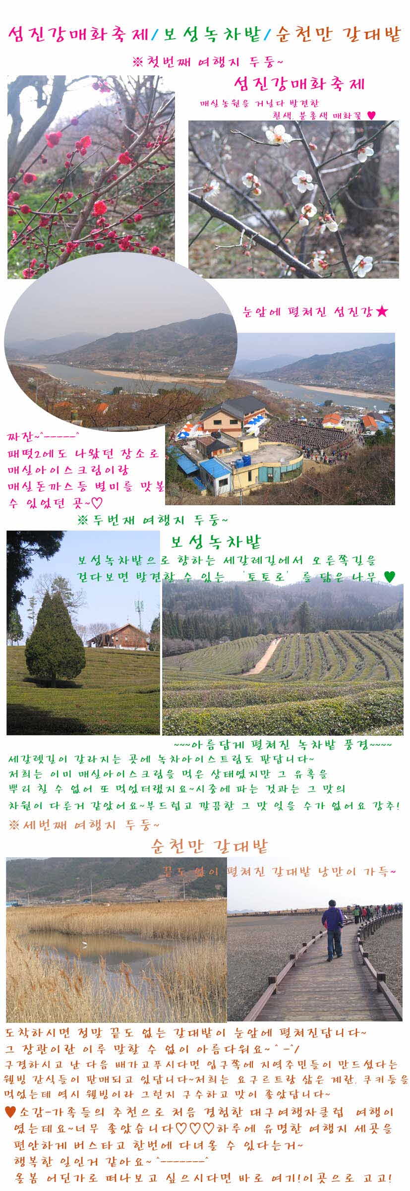 제목 섬진강매화축제+보성녹차밭+순천만갈대밭으로 고고씽! 등록일 10.03.22 조회 527