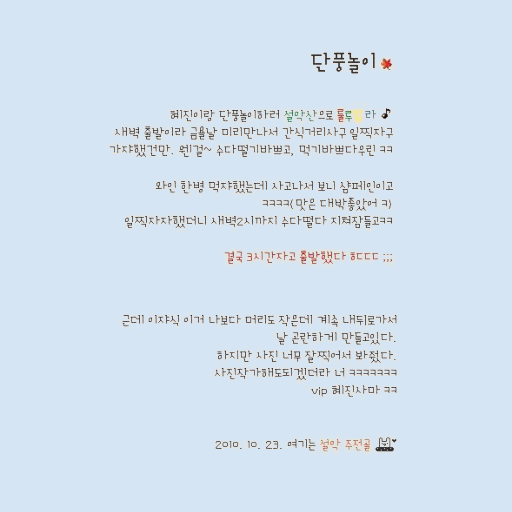 고등학교 수학여행 이후 설악산은 처음이었는데 정말 말로는 다 표현할수 없을만큼 아름다운곳이었어요 제 카메라에 그 절경이 다 담기지않아 너무 아쉬웠습니다 ㅠㅡㅠ 그래도 제 기억속엔 생생하니깐.!! 정말 진짜 최고였어요. 올 한해 여행하면서 가장 기억에 남는곳이 될것같아요. ㅎㅎ 최장거리. 대구도착하니깐 10시더라구요.. 장시간 운전에 피곤하셨을텐데 저희들 안전하게 대구까지 데려와주신 멋진 기사님, 가이드님 감사합니다. 즐거운 여행이었어요. 담에 또 뵈요 ^-^