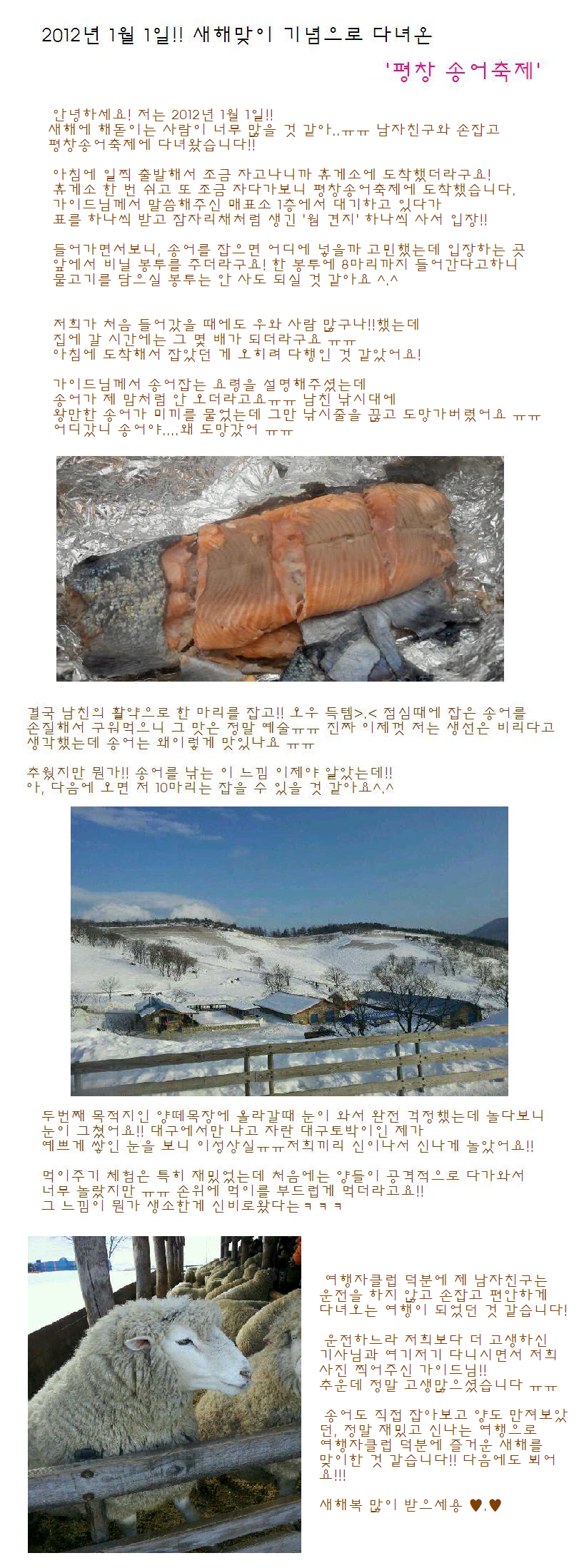 제목 평창송어축제!! 추웠지만 너무 기억에 남아요♥.♥ 등록일 12.01.04 조회 588