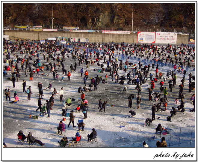 강원도의 화천에서는 매년 1월이면 전국에서 가장 빨리 가장 두꺼운 얼음이 어는 화천의 산천어 축제는 산천어 낚시와 더불어 얼음썰매,눈조각, 산천어공방체험등 다양한 프로그램들로 구성된 볼거리가 가득한 겨울철 이색테마 축제이다. 작년엔 구제역때문에 행사가 치뤄지지 않아서 2년만에 열린 축제라서 그런지 첫날부터 만명정도가 참가한것 같다고 했다. 얼음낚시장의 최대인원 수용은 7천명인데 2시쯤되자 더 이상 입장할 수 없다는 안내방송이 나왔다. 직접 낚은 산천어는 회뜨는 곳에서 회를 직접 떠주기도하고 구이로도 해먹을 수 있다. 작은 소도시에 갑자기 많은 인파가 몰려서인지 더러 불편한 사항도 생긴다. 하지만 그런 불편함을 감안하고서라도 한번쯤은 가볼만한 겨울 산천어축제~ # 참고로 산천어 잘 잡는 팁을 하나 소개합니다. |