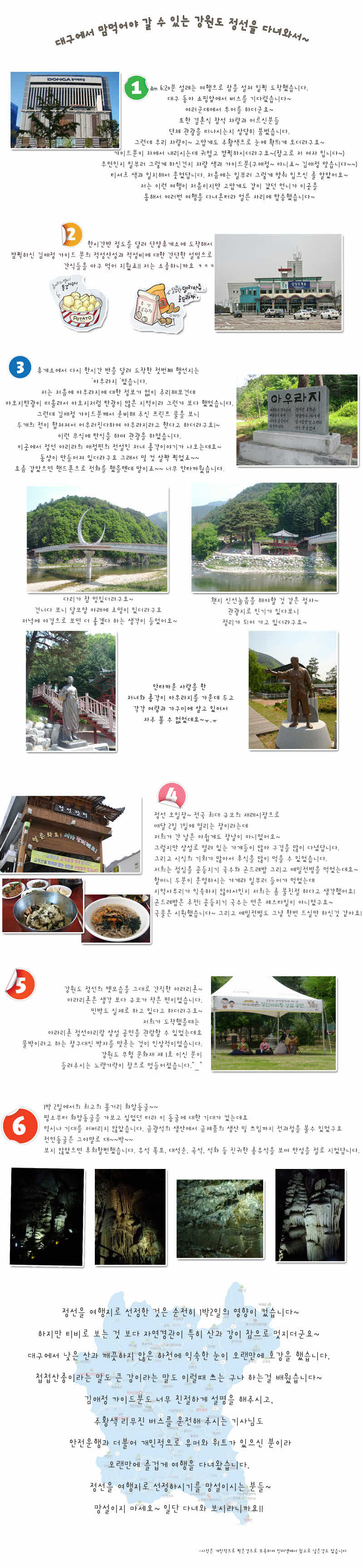 제목 ★대구에서 맘먹어야 가는 곳 강원도 정선(아우라지, 정선장, 아이랑촌, 화암동굴) 등록일 12.05.21 조회 823