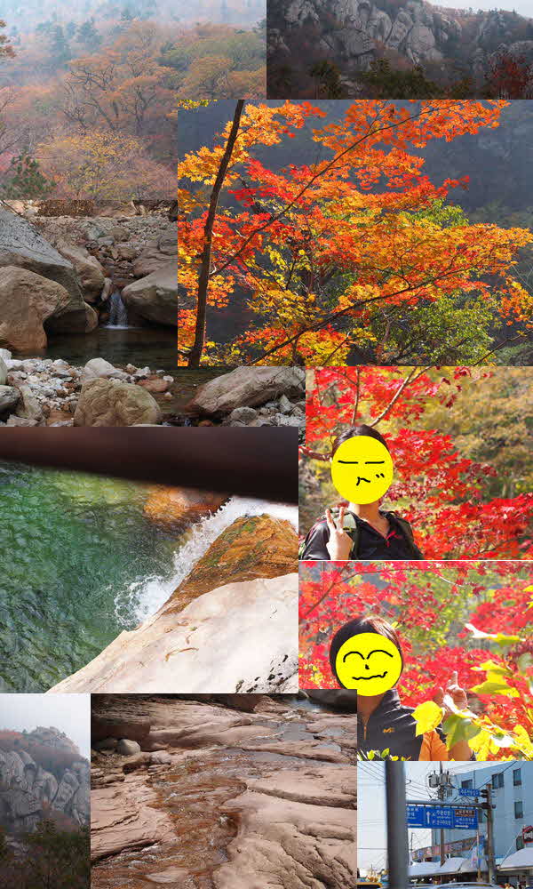 아침일찍 출발해서 11시경 눈앞에 고지를 앞두고 차가 막혀서 매우 애간장이 탔습니다. 덕분에 더욱더 아름다운 단풍을 즐길 수 있었습니다. 많은 여행사에서 설악산 단풍을 보기위해 온 것 같았구요. 갔더니 단풍이 오히려 정상보다는 한계령 올라가는 도로쪽이 훨씬 더 아름답게 물이 들었습니다. 날씨도 적당한 구름과 적당한 햇볕으로 최고였습니다. 물도 얼마나 개끗하던지