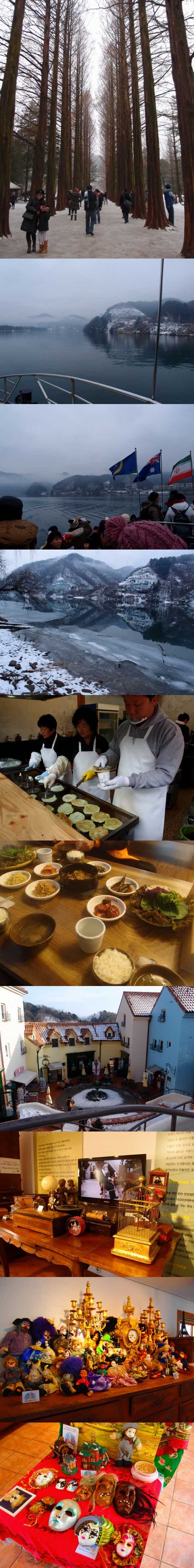 남이섬에 도착하니 한류열풍의 인기에 걸맞게 많은 외국인 관광객들을 태운 버스가 줄지어 있었습니다. 남이섬에 들어가기위해서는 배를 타야하는데 탑승시간은 5~10분정도 소요됩니다. 매표소와 배를 타기위한 선착장은 가평, 배를타고 들어가면 도착하는 남이섬은 춘천.. 안개가 자욱히 끼어있어 더욱 신비로워보이는 남이섬으로 배를 타고 들어갔습니다. 남이섬에 도착하여 하선하니 수많은 관광객들과 중국인,일본인,서양인 등 다양한 외국인 관광객들이 많이 있었습니다. 남이섬 하면 떠오르는 그것!! 겨울이라 잎이 없이 앙상한 가지만 남아있었지만 소복히 눈이 쌓여 로맨틱한 풍경은 여전했습니다. 눈이 왔다가 낮에 녹고 다시 얼어서 그런지 곳곳에 미끄러운 길이 있었는데 여행가시는 분들은 구두나 굽이 있는 부츠보다는 미끄럽지 않은 운동화나 등산화를 신는게 좋을 것 같아요 ^^ 자전거를 대여해서 타고 구경을 할 수도 있는데 길이 미끄러워 겨울에는 힘들 것 같구요.. 관광객들이 많아서 성수기때도 도보로 관광하는 게 좋을 것 같아요ㅎㅎ 메타세콰이어길을 따라 쭉 가면 호수가 보이는데 눈과 얼음이 어우러져서 알프스 못지않은 장관을 뽐내고 있었습니다. 눈으로 본 것을 카메라가 다 담지 못해서 아쉬웠구요 강원도라 대구보다는 춥긴 했지만 날씨가 좋은 편이라 즐겁게 관람하고 나왔네요.. 그리고 긴 줄을 서서 먹었던 녹차호떡 !! 여행에서 빠질 수 없는게 군것질이겠죠 ^^ 남이섬 구경을 마치고 우렁쌈밥을 먹으러 식당으로 이동했습니다. 가이드님이 식사는 남이섬에서 나와서 하는 것을 추천한다고 하셔서 바깥에 나오니 달콤한 닭갈비 냄새가 나더라구요~ 흔하게 먹을 수 있는 닭갈비 대신 우렁쌈밥을 먹으러 갔는데 푸짐한 밥상은 아니지만 밥에 슥슥비벼 쌈을 싸서 한입 넣으면 속이 든든하게 엄청 맛있더라구요! 각각의 계절마다 다른 풍경을 보여주는 남이섬.. 그리고 시크릿가든의 쁘띠프랑스를 갔습니다. 여러가지 테마로 꾸며진 방들이 여러개 있었는데 "어린왕자"를 테마로 꾸민만큼 곳곳에 어린왕자를 볼 수 있었고 주택전시관에 들어가니 어디선가 새소리가 들려서 가보니 연인끼리 간다면 종을 걸어놓은 탑이 있는데 미리 종을 준비해 가서 소원을 적고 걸어놓고 오시면 좋을 것 같아요 ~ 쁘띠프랑스는 알록달록한 건물도 많고 배경이 예뻐서 사진찍기가 좋은만큼 카메라와 휴대폰 배터리를 넉넉하게 챙겨가는 게 좋겠죠?ㅎ 겨울의 추위를 낭만적인 여행으로 만들어주신 대구여행자클럽에 감사드려요 ^^ |
