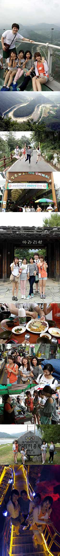 성당친구4명, 그리고 신랑과 함께 떠난 강원도 정선행 여행!! 홍정민 미녀 가이드의 친절한 설명으로 더욱 알차고 즐거운 여행이 되었던 것 같습니다. 일정또한 너무 마음에 들었고 세심하게 버스 도착 시간을 매번 문자로 보내주신 미녀가이드님 다시 한번 감사해용 1박2일에 나온 곳이라 더더욱 기대가 컸던 스카이워크! U자 모양을 걸어 출구로 나오면 시간이 남을 거라며 매표소 옆에 있는 나무 계단을 따라 올라가면 전망대가 있으니 다녀오면 좋겠다는 가이드의 설명을 듣고 우리는 다시 전망대로 고고!! 시원한 바람과 바로 옆 쪽에 짚라인 타는 소리에 다시 한번 즐거운 비명을 질렀습니다^-^ 다음에 꼭 짚라인 타러 다시 가고 싶어요!! 한반도 모양을 닮은 신기한 광경과 탁 트인 자연앞에서 두 번째 일정은 정선5일장이었습니다. 시장 이곳저곳을 둘러보며 시식도 하고 중간 무대에서 펼쳐지는 정선아리랑 공연도 함께 보며 즐거운 시간을 보냈습니다. 가이드의 말 처럼 흥정을 하여 곤드레나물도 구입하구요^-^ 3번째 일정은 멀지않은 곳에 있었던 아라리촌!! 햇빛이 있어 조금은 더웠지만 걱정없었어요, 다음 일정은 바로 시원한 화암동굴이었으니깐요^-^ 화암동굴,, 정말 그 규모에 반하지 않을 수 없었어요 역시나! 동굴에서 나오니 미녀가이드가 사진을 찍어주셨어용^^.. 가이드님이 찍어준 사진은 다 잘나왔어요!!꺅!! 대구로 돌아오는 내내 잠에 취해있었던것같네요.