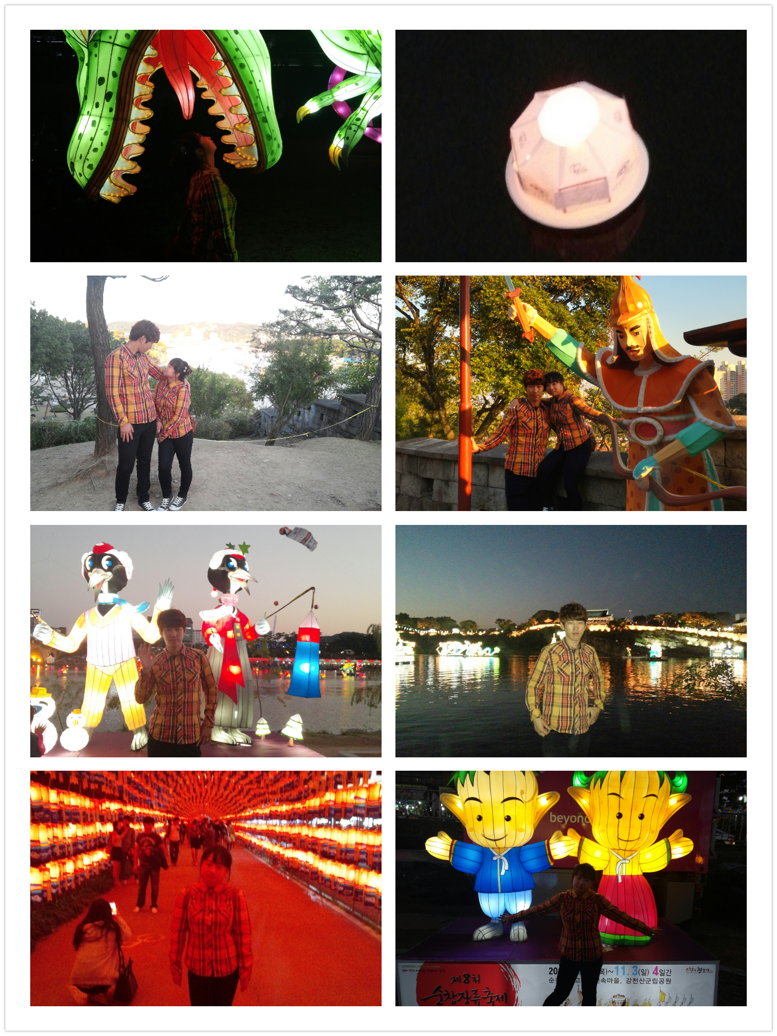 그래도무사히 타고출발~~~순천만갈대밭을 제일먼저갔는데 너무넓었다 ~~~ 전망대까지 올라간다고 고생했으나 경치는죽였다~ 근데첫코스에서 너무 진을빼서 좀그랬다 시간도 솔직히 전망대까지 갔다오기엔 빠듯했다 우린 20대젊은부부였는데도 빡셨다~ 땀흘리고 나니까 팥빙수팔길래 사먹으니꿀맛! ㅎ 잘보고 오동도로 출발~ 도착하자마자 밥먼저 먹었땅~ 우린 간장게장을 별로안좋아해사 낙지볶음시키니까 양념게장은 반찬으로 나왔다 맛나서 3번은 리필 했더랬죠~ 푸짐하게 먹고 오동도 구경~ 밥먹고나니시간이부족한거같아서 동백열차타려면 기다려야된다고 해서 커플자전거타고 쓩~~~넘 신났다 바다를보면서같이 달리니 신났다 음악분수구경하고 오동도는생각보다작았다~ 그래도 바다 보면서 커플자전거는 너무좋은추억이되었다 그렇게보고 진주로출발~ 좀 피곤했다 너무 많이걸었어~~~ 유등축제 신기방기~ 볼꺼리 즐길꺼리 정말많았다~ 유등띄우기하는데 가슴이뭉클 소원 적기도 많이하고 드림캐쳐도사고 꼬지도사먹고 공연도보고 부표도건너고 ~~~ 피곤해도 할껀다하고 볼껀 다보고~ 신나는 하루였다! 집에와서 바로뻗긴했지만~ 알찼다~ 근데 유등축제말고는 시간이 부족했다~ ㅎ 잘놀다 왔습니다~ 찌롱언니도 수고하셨어요~ 커플사진도많이찍어주셔서감사했어요~ 다음 여행때 뵈요~~^^ |