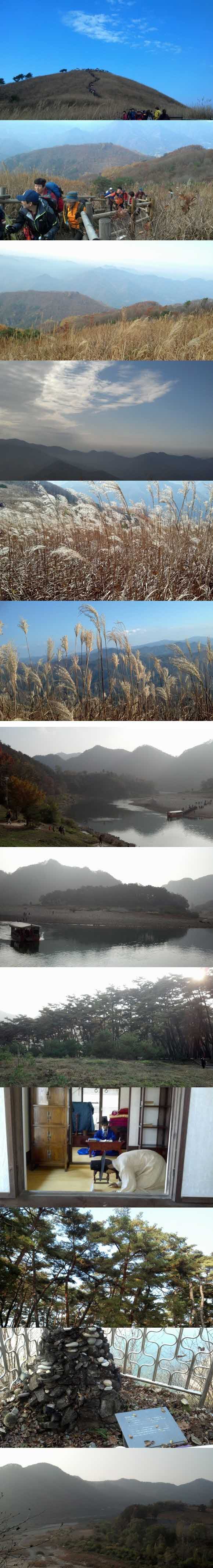 우선 여행에 있어서 가장 중요한 날씨는 좋아서 다행이었습니다! 여행 상품 중에 안가본 곳, 절정인 단풍 구경을 할 수 있는 억새꽃축제를 선택했습니다. 바빠서 대충 봤는지 동산 정도로만 생각했는데... 해발 고도 1119M라니! 등산화와 가벼운 옷차림이라 다행이었지만 혹시 내년에 가실 분은 꼭 등산장갑과 함께 등산 스틱은 필수라고 말씀드리고 싶네요, 전날 비가 왔었다고 해서 미끄러질까봐 조심조심 완경사 코스로 산행을 시작했습니다. 예상대로 낙엽과 함께 초반에 경사가 있어서 힘들었지만 매점에서 쉬고 조금만 더 올라가니 억새꽃이 장관을 이루더군요, 전날 비가 와서 하늘도 청명하니 완연한 가을 푸른 하늘 이었습니다. 공기도 좋고 억새꽃 풍경도 멋지고! 땀 흘리며 등산한 보람을 느꼈습니다. 정상에서 사진도 찍고 준비한 컵라면과 삼각김밥, 커피 한잔하고 천천히 하산했습니다. 길에 타이어 비슷한 게 깔려 있어서 오히려 더 미끄러운듯도 하고 아무튼 무사히 산을 내려와 이동하는 차안에서 폭풍 수면으로 피로를 조금이나마 회복하고 다음 목적지인 청령포 단종 유배지에 도착했습니다. 17 나이에 생을 마감해야했던 아픈 역사가 살아숨쉬는 곳이었습니다. 몸은 힘들었지만 땀도 흘려서 개운하고 억새꽃 풍경도 멋진 여행이었습니다 ^-^* |