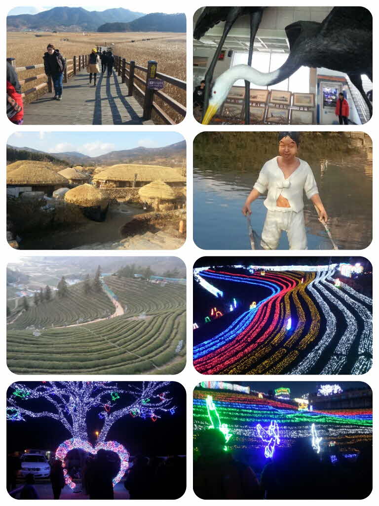 타고 좋은사람과 즐건 여행 잘 다녀왔어요~ 비록 버스안에서 편하게 잘 쉬지못해 좀 불편하긴했지만~ 흑흑흑 ㅠ.ㅠ 어쨌든 처음으로 가 본 순천만 갈대밭은 와~~ 정말 넓고 넓더군요 ㅋㅋㅋ 비록 바람이 쌩쌩 불어서 추위에 떨긴했지만 갈대숲 사이 를 바람소리와 함께하면서 산책하는 길이란~ 운치있고 좋더군요~^^ 신발의 미스선택으로 용산전망대까지 가는데 발도 아푸고 40분이란 시간의 압박이 있긴했지만 와와와~~~ 올라가니 갈대밭의 모든 전경이 짠~~~!!! 모든 힘듦이 다 사그라지는 느낌이더군요 ㅋㅋㅋ 전망대 올라가는 중간에 흔들흔들 다리도 잼났어요~^^ 그렇게 구경을 다하고 중간중간 사진도 찍고 이래저래 댕기다보니 점심시간이 촉박해져 내려와서 그 유명한 꼬막정식을 못먹었네요~아~아쉬워랑 ㅠㅠ 참 흑두루미???요 아일 보면 소원이뤄진다고 했는데 못만났네요 ㅋㅋㅋ 그래서 박물관안에 대형흑두루미 구경했는뎅 우와~~~~ 멋지드라구요~근데 흑두루미 실제로 만날 수 있기는 한걸까요?ㅎㅎㅎ담엔 꼭 나타나주렴~ 암턴 순천만 갈대밭을 뒤로 하고 그 담 목적지 낙안읍성으로 출발~~~~ 낙안읍성은 우리나라 3대민속마을 중 한곳으로 안동의 하회마을, 경주의 양동마을과는 반대로 일반 상민 의 주거형식인 양민촌의 모습을 간직하고 있는곳이래요~ 도착해서 읍성안으로 들어가니 옹기종기 초가집들이 모여 있는데 보존도 잘 되어있고 정겨움도 느껴지고 볼것도 많 더라구요~~~ 가이드님말대로 번데기 아줌마?그 옆 사이골목으로부터 해 서 쭉 구경하니깐 효율적으로 구경잘한거 같애요~ 감사합니데이~~^^ 성곽위에서 읍성의 내부를 내려다봤는데 와~~ 드넓은 평야에 옹기종기 모여있는 초가집들이 참 정감가 고 멋지드라구요~먼가 따뜻해지는 기분이랄까요?ㅎㅎㅎ 주변 곳곳에 민속놀이체험 할 수있게 마련해논 공간도 좋 았구요~대형 그네가 있었는데 타보고 싶었는데 못탔어 요...그 다음 사람을 위해서 조금만 양보해주세요옹~~~~ 대장금의 세트로 사용됐던 초가에는 사진들도 많이 붙어있 고 돌담길과 흙길을 걸어다니는것도 참 좋았어요~언제 다 시 걸어볼 일이 있을까요?ㅎㅎㅎ 중간중간 가는길에 옛스럽게 꾸며놓은 모형물 보는 재미 도 쏠쏠했답니다~ 개인적으로 넓은 연못에서 혼자 고기잡기 하고 있는 배꼽 내놓은 청년이 젤 기억남는군요 ㅋㅋㅋ 참 안에 민박도 많이 하드라구요 참고하세요ㅋㅋㅋ 그렇게 이곳저곳 사진찍으면서 구경하다보니 시간이 촉박 해져서 아쉬움 뒤로 하고 나왔어요~ㅠㅠ 이제 마지막 여행지 종점 보성녹차밭으로 고고씽~~ 도착하니깐 아직 불빛이 들어오지 않아서 휑하드라구요 그렇게 기다리다가 5시30분쯤 드뎌드뎌 그렇게 기다리던 불빛들이 짠~~~~~ 아아~~~드넓은 녹차밭사이사이로 불빛이 반짝반짝 들어오 는데 와와~~넘 예쁘드라구요~ 그 휑하던 녹차밭이 형형색색의 불빛이 들어오니 마치 한 폯의 그림처럼 얼마나 눈부시고 이뿌던지 ㅋㅋㅋ 불빛은하터널인가 거기에 천원인가 엽서 사서 메모적어서 걸어둘 수 있드라구요~요것도 나름 좋은 추억일듯요~^^ 갈대밭에서 먹지 못했던 꼬막정식 대신 보성녹차밭에선 꼭 녹차 아이스크림 먹을라했는데 못먹었군요 또 아숩어라 ㅠㅠ 암턴 순천반 갈대밭,낙안읍성,마지막 보성녹차밭까지~ 모든 일정을 마치고 대구에 9시30분쯤에 도착했습니당~ 비록 많이 걸어다녀서 발도 아프고 추위에 힘들었지만 잊 지못할 좋은 추억여행이 된거 같아 좋아요~^____^ 어느 한곳 나무랄것없이 참 좋았어요~^^ 대구여행자클럽 덕분에 좋은여행 하고 와서 감사드려요~ 앞으로도 좋은여행지 많이많이 만들어주세요~~~ |