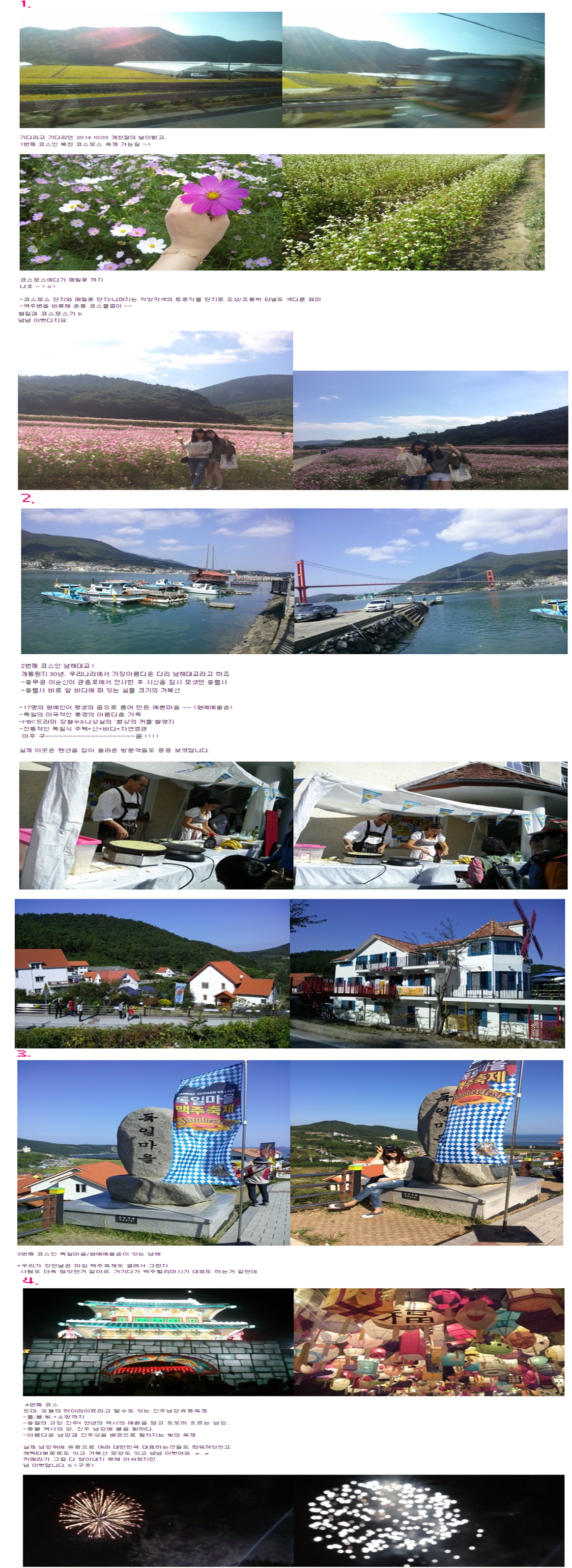 | 제목 | ★우정여행★가을여행★북천코스모스축제,남해독일마을,진주남강유등축제 | 등록일 | 14.10.26 | 조회 | 352 |