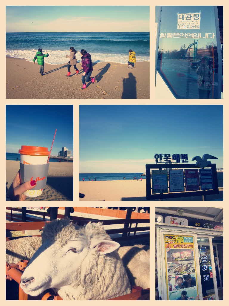 해맞이여행 가고파 애타는 여행자는 대신에 1월 첫여행으로 안목항 드뎌 다시 갑니다. 그간 몇번의 취소로 안목항을 못 가봤는데 토욜이라 그런지 순조롭게 모객이 이루어져서 오매불망 푸른 안목 해변을 원없이 바라본 하루였네요. 양떼목장은 정말 많이 가봤는데도 주문진항에서는 지난번 들렀던 구이본부25시를 가려다가 대망의 안.목.해.변! 오늘이 짧은 겨울 휴가 마지막날이라 포스팅이 매번 식상하다 하실듯하여 |
