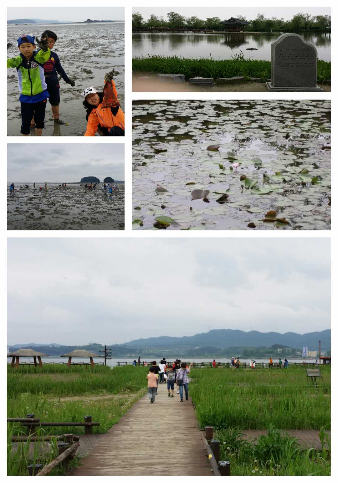 많은 여행후기를 둘러보았지만 그중에서도 단연 돋보인 서천 갯벌체험의 후기들이 여행전부터 많은 설레임을 주었는데 출발할때 대구 날씨는 오전까지도 보슬비가 내리고 그리 좋진 않았는데 우리가 도착한 충남 서천의 날씨는 갯벌체험하기에 최적의 날씨여서 아이들과 시간가는줄 모르고 드넓은 갯벌을 누비며 조개캐기를 했답니다. 작년에는 조개가 풍년이라 조개 쓸어모이기 수준이었다고 설명해주시던 우리 멋진 짱가이드님의 말씀이 상상이 갔었답니다. 그리 어렵지 않게 준비해간 양파망에 어른들도 아이들도 소복소복 쌓아 갯벌과 작별을 했답니다. 캐간 조개를 바닷물을 담아 아이스박스에 포장하는 비용 1000원을 지불하고, 대구로 갈 채비를 해놓고 바로앞 식당에서 조개 반 칼국수면이 반인 해물칼국수와 싱싱한 조개구이로 배를 가득채우고 가까이에 있는 JSA공동 경비구역과 추노 촬영지로 유명한 곳이기도 한 신성리 갈대밭으로 고고~~~ 가을의 갈대밭과 여름의 갈대밭의 풍경은 달라서 놀랐답니다. 더구나 초록의 푸른 갈대밭이라니,처음보는 그곳의 경치는 실로 멋지지 않을수 없었습니다. 다음으로 향한 곳은 선화공주와 호동의 이야기로 유명한 부여 궁남지였습니다.우리 짱가이드님이 도착하기 앞서 설명하신 얼굴은 똑같고 머리길이만 다른 호동과 선화공주의 동상은 사라지고 없어서 확인할 방법이 없어서 아쉬웠답니다. 경주의 안압지가 있다면 부여엔 궁남지가 있다고 설명한 그대로 아주 다소곳이 연꽃과 연못과 다리가 잘 어울려진 풍경의 길을 걸을수 있어서 행복했답니다. 이번 체험여행의 행복했던 여운을 뒤로 하고 아이들과 가벼운 발걸음으로 우리 두가족은 일상으로 돌아왔답니다. 다음번 오월의 여행을 기약하며 우리 이쁜 짱가이드님과의 여행도 다음을 기약하며.... |