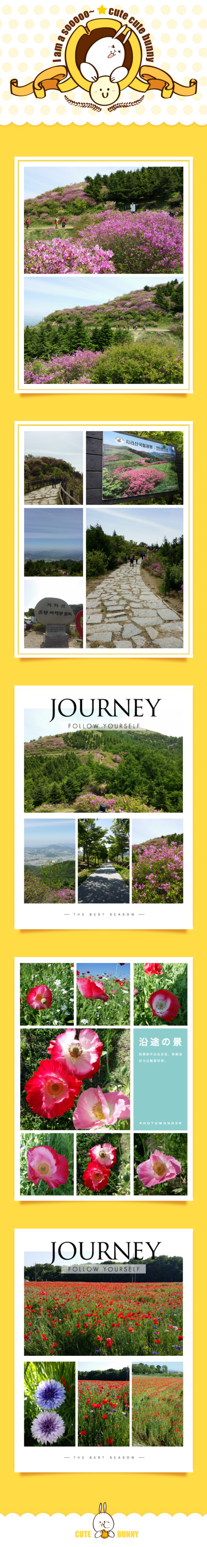 후기를 찾아보니까 생각보다 가파르고 힘들다는 글들이 많아서 망설여지기도 했지만.... 일단 내 취향으로는 강천산이나 선운산 같이 계곡 끼고 편안하게 트레킹 할 수 있는 산이 맞겠다 싶었다. 지리산 바래봉 코스는 길은 잘 닦여 있지만 바닥이 거의 돌이 깔려 있어 흙보다 불편했고, 다른 후기 쓴 분들처럼 경사가 좀 있어서 힘들었다. 특히 바래봉 정산은 많이 가팔라 등산화를 갖춰 신고 가는 것이 나을 것 같았다. 일반 운동화를 신었더니 미끄러질까봐 조심스럽고 무섭기도 했다. 그리고 철쭉 군락지는 바래봉과는 다른 코스라고 한다. 아래쪽은 철쭉이 이미 다 졌고, 정상에 철쭉이 좀 피어있었다. 올라갈때 너무 힘들었지만, 막상 정상에 가서 시원한 바람을 맞으니 이런 맛에 등산들 하는구나 싶었다. 오다가 한시간 가량 함양의 상림숲을 들렀는데, 뜻밖의 월척을 낚았다. 상림숲은 역사가 천년이 넘어 신라말에 조성이 되었다는데 오래된 숲 같지 않게 요즘의 공원과 비슷했다. 가볍게 산책할 만한 코스였는데, 그 옆에 양귀비밭이 정말 환상적이었다. 엄청 넓은 규모의 양귀비가 바람에 붉은 물결을 이루는 풍경이 정말 아름다웠다. 초입에는 새빨간 붉은 양귀비만 있는데 안으로 조금 더 들어가면 꼭 예쁜 한복을 연상시키는 색색깔의 양귀비들이 많아 눈이 호강하고 왔다. 그리고, 배정된 버스가 나온지 얼마 안되는 따끈따끈한 새 버스로 실크로드라고 하던데, 타자마자 기분좋은 버스였고, 박은화 가이드님과 기사님도 편안한 여행을 도와주셔서 정말 감사해요. |