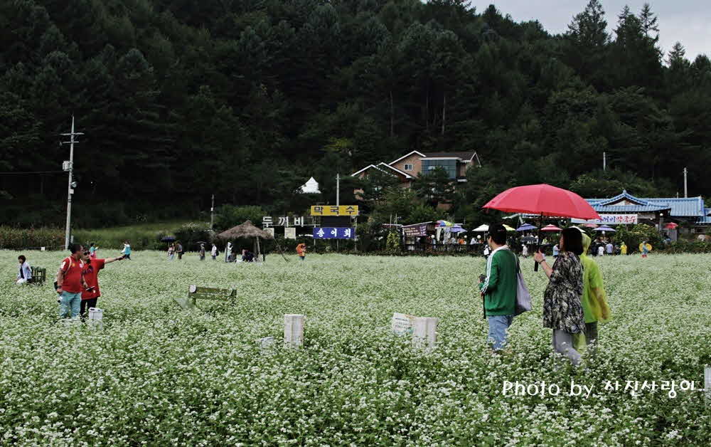 06;30 범어동 출발. 지하철 2호선 첫차를 타고 다소 여유있게 버스있는 곳에 도착했다. 혼자 맨 앞자석에 앉았는데 종일 혼자였다. 벌초행사 때문에 차가 1시간 반 정도 늦게 오후 1시 30분경에 봉평 메밀꽃 축제장에 도착했다. 축제장이라 사람들이 많이 붐볐다. 주어진 시간내로 구경하고 사진도 찍기로 마음먹고 메밀꽃밭을 들러본후 물레방앗간 앞에 도착했을때 모델분을 앞에 세우고 촬영대회를 하느라 카메라맨들이 숨을 죽이며 셔터를 눌렀다. 또 나룻배가 있는 곳에서도 역시.... 너무 늦은 관계로 대회에 불참하려다가 여기까지 왔는데 한번해보자는 생각에 오후 4시에 촬영대회가 끝나는 시간쯤 마지막순서로 등록을 하고 메밀국수로 점심식사를 했다. 오늘은 신은미 가이드의 능숙한 안내와 운전 기사님의 배려로 늦게 도착했으니 1시간 30분을 더해서 오후 5시 까지 버스에 탑승하라는 말이 너무나 고마웠다. 앞으로 계속 대구여행자클럽을 이용하여 여행을 많이 할 것이다. 운전기사님, 그리고 신은미 가이드님. 너무 너무 감사합니다.