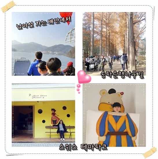 가족들과 함께 떠난 여행이다 보니 시간이 잘 맞지 않아서 단풍여행시기를 놓치고 늦은 여행을 고고!! 남이섬은 워낙 먼거리여행이어서 이른 출발에 4시간 정도 차안에서 쭈욱 덜깬 아침잠을 달래면서 시작합니다. 첫번째 코스로 오전 10시경 남이섬도착 남이섬하면 겨울연가 촬영지로 유명한 곳. 남이섬에 들어갈 수 있는 방법은 배를 타고 가던지 짚와이어를 타고 들어가는데 저희는 배를 타고 가는 코스였어요. 우리가 탄 배는 200명정도 탑승할 수 있어서 별로 기다리지 않고 바로 바로 탈 수 있고 아주 천천히 운행해서 주변 경관도 감상하다 보면 5분내로 도착.. 주변 경관은 비가 그친 뒤여서 맑고 깨끗한 날씨로 넘 덥지도 넘 춥지도 않고, 성수기가 아니어서 오히려 혼잡하지 않아서 좋았어요. 입구에서는 작은 공연이 열리고, 낙엽이 떨어져 가을의 절정은 지나갔지만 송파은행나무, 메타쉐콰이어 나무로 조성된 숲길은 가족들끼리 손을 잡고 즐기면서 사진도 찍고 걷을 수 있는 좋은 산책로랍니다. 특히 산책하다 보면 공작, 청솔모, 토끼, 낙타도 만날수 있어요. 매주 일요일은 김장체험도 하고 있었지만, 우리는 토요일이어서 패스~~ 특히 동남아 관광객이 우리보다 몇 배는 더 많아서 동남아관광객에게는 인기최고 엄지척 ^^ 가족단위로 꼭 한번 가보면 좋을 코스로 완죤 추천...다음에는 짚와이도 한번 타보고 싶네요. 남이섬에서는 여유와 낭만을 즐길 수 있는 있는 공간도 많고 간식과 식사도 가능했지만 우리가족은 남이성 바깥에서 점심을 먹기로 결정 남이섬 입구에 유명한 닭갈비집이 있다고 해서 그곳에서 닭갈비로 점심을 해결... 인기에 비해서는 맛은 보통 대구랑 비교해서 특별한 맛이 없네요. 두번째 코스로는 에델바이스 스위스테마파크 마치 동화 속에 나라에 온듯한 이국적인 느낌을 갖게 되는 곳.. 에델바이스 테마파크는 각각의 건물이 스위스와 관련된 치즈박물관, 산타 빌리지,초콜렛박물관, 커피박물관,러브프로테마관으로 이루어져 있고 내부에도 여러가지 볼거리가 풍성하고,사진촬영도 가능하고...아기자기하게 꾸며져 있어서 연인,가족단위로 부담없이 즐길 수 있는 피크닉코스로 좋네요 저는 알프스 소녀 하이디 옆에서 한 컷.. 또 탈인형을 쓰고 한 컷. 근데 냄새 주의 ㅋㅋ 그리고 버스에 탑승해서 이제 대구로 돌아갈 시간. 차가 많이 막혀서 버스기사분 넘 수고하셨고, 또 그날 대구에서 촛불집회가 있어서 버스로 대구시내 이동이 불가해서 나머지는 지하철로 귀가했어요. 안전운행 해준 남이섬1호차 운전기사분과 촛불집회 같은 변수가 있어도 유연하게 대처해준 이다겸가이드께도 감사드립니다. |