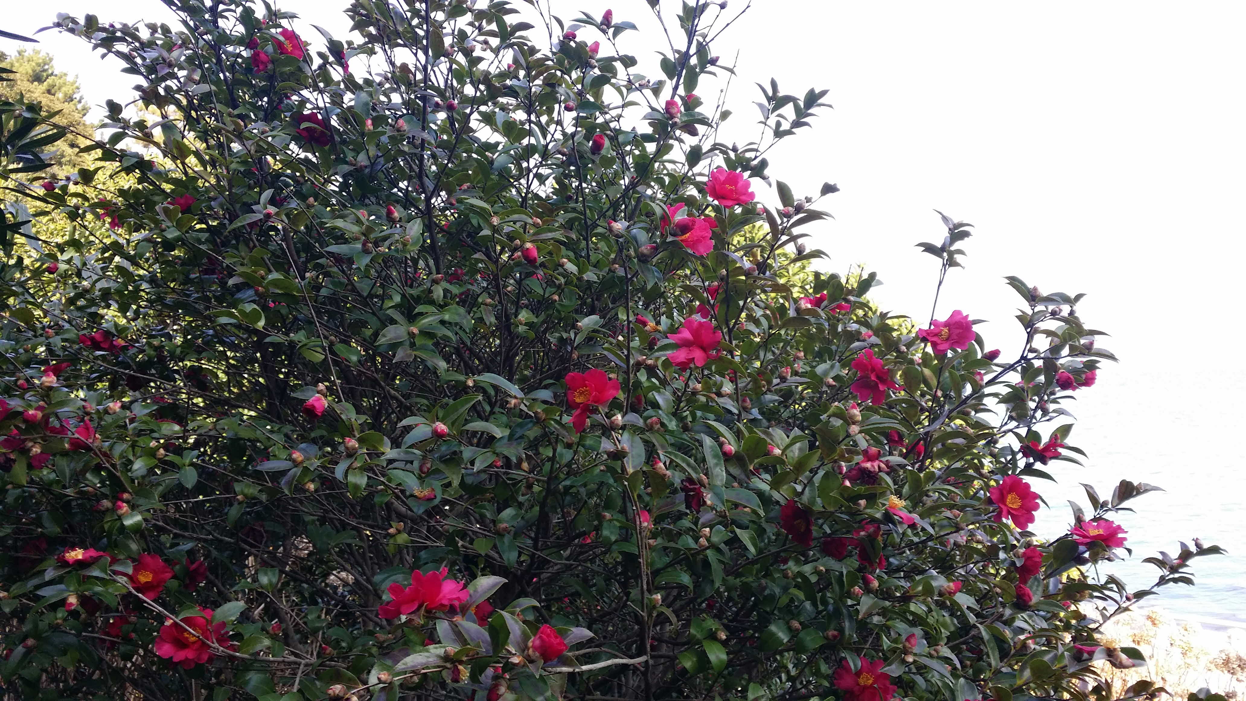 애기동백은 활짝 펴고 큰 동백은 이제 꽃이 피고 있는 중입니다.