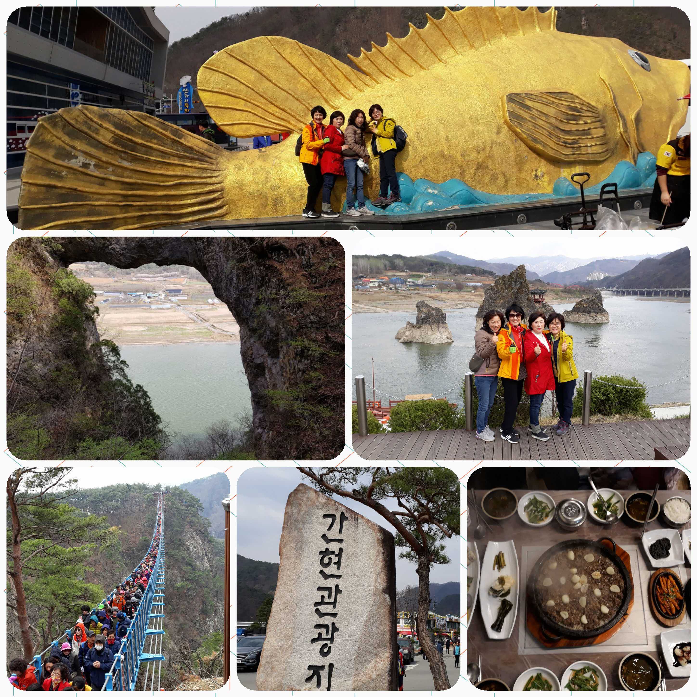 일찍 집을 나서니 날씨가 장난이 아니네. 버스를 타고 올라가다 보니 4월에 왠 때아닌 눈발까지 날리네 오늘 소금산 출렁다리 건널수나 있을까 걱정하는데 다행히 간현주차장에 내리니 눈은 오지 않는데 꽃샘 추위에 바람까지 불어서 엄청 추웠다. 친구들과 많은 사람들속에서 아찔한 출렁다리 건너면서 하하호호... 추위도 잊은체 즐겁게 사진도 찍고..웃고..정담도 나누고..^^ 단양시장에 들러 미강이라는 식당에서 맛있는 마늘석불고기 정식으로 다음 코스는 단양8경 중에 1경인 도담삼봉과 2경인 석문.. 2018. 4. 7 수고해주신 귀염둥이 김민수 가이드님과 |