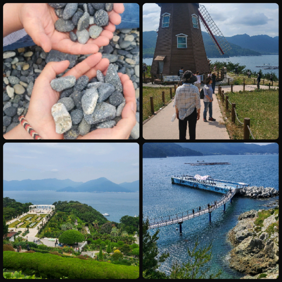 여행다녀온 사진 프샤에 올리자 인기만점 이번에도 여행지선정 대성공이네요 외도는 처음가는거라 기대가 컸어요 이은민가이드님 친절하게 버스사진보내주셔서 멀리서도 우리버스 바로 찾았네요 고급스런블랙 ㅎ 가는중간중간 설명도 잘해주시고 너무 친절했어요 외도가는 유람선을 타는순간 아 진짜 여행이네 실감 여행객들이 많아 유람선 좌석이 만석되고 자리못잡은사람도 있었어요 선장님의 안내멘트를 듣고 우린 신나게 2층으로 올라갔어요 배안에서 보는 바다랑 완전 달라요 가까이서 섬도 보이고 멀리있는섬들도 멋지네요 새우깡챙겨오신분들이 손을 들자 갈매기들이 떼지어 오고 그걸 놓칠세라 사진찍느라 너무 재미있었어요 아저씨한분은 갈매기가 안물고가니까 자기가 먹어버리더라고요 그모습에 얼마나 웃었던지 ㅎㅎ 그렇게 바다바람을 맞으며 외도도착 이야 진짜 이뿌다 소리가 저절로 나오고 그동안 왜 못왔을까 후회도 되고 나무한그루한그루 꽃한송이한송이가 이렇게 고울줄이야 처음보는 꽃들도 너무 많았고 엄청 큰 선인장 야자수는 마치 외국에 있는 느낌이었어요 지금은 고인이되신 이창호설립자님께 마음으로나마 감사를 드립니다 지금의 행복이 그분이있었기에 임은 울지않지만 우리는 울고있고 임은 아파하지않지만 우리는 아파합니다 비석에 새긴 글귀가 짠하게 마음을 울립니다 다시 유람선을 타고나와 몽돌해수욕장으로 대학다닐때 친구들이랑 놀러왔던 그곳 이렇게 여행지로 선정되다니 그때의 몽돌이 지금의 몽돌인가하며 해수욕장에 앉아 몽돌을 만지작거리며 옛추억을 떠올려봅니다 구름에 가려있던 해도 나오고 몽돌이 반짝거리며 너무 이뻤어요 여행의 묘미 맛난거먹는게 빠질수없죠 바닷가라 횟집이 많았는데 우린 멍게수족관을 보고 멍게비빔밥으로 결정 싱싱하게 바로잡아서 주시니 진짜 맛있었어요 바다를 보면서 친구들과 담소를 나누며 맛있는음식을 같이먹으니 금상첨화 그리고 마지막코스로 이동 신선대와 바람의언덕 버스에서 내리자 신선대가 바로 보이고 정말 신기했어요 바위가 겹겹이 쌓인게 세월을 말해주듯 남는게 사진이라며 가이드님께 사진도부탁 여러포즈로 잘찍어주셨어요 신선대반대쪽 바람의 언덕으로 이동 저멀리 멋진 풍차가 우리를 반기듯 힘차게 돌고있었어요 풍차가 있는 바다쪽으로 가니 점점 바람이 세게불고 우리는 그바람이 너무좋아 양팔을 벌리고 아이처럼 신나했네요 바닷바람인데 전혀 습하지가 않았어요 우리는 벤치에 앉아 바다구경했어요 시원하고 멋지고 한참을 거기서 쉬었네요 더울때 오면 정말 좋을것같네요 몽돌해수욕장에서 발담그고싶던데 운동화신고가서 못했어요 여름에 샌달신고가시면 발담그고 시원할거같아요 외도ㆍ몽돌해수욕장ㆍ바람의언덕코스 강추합니다