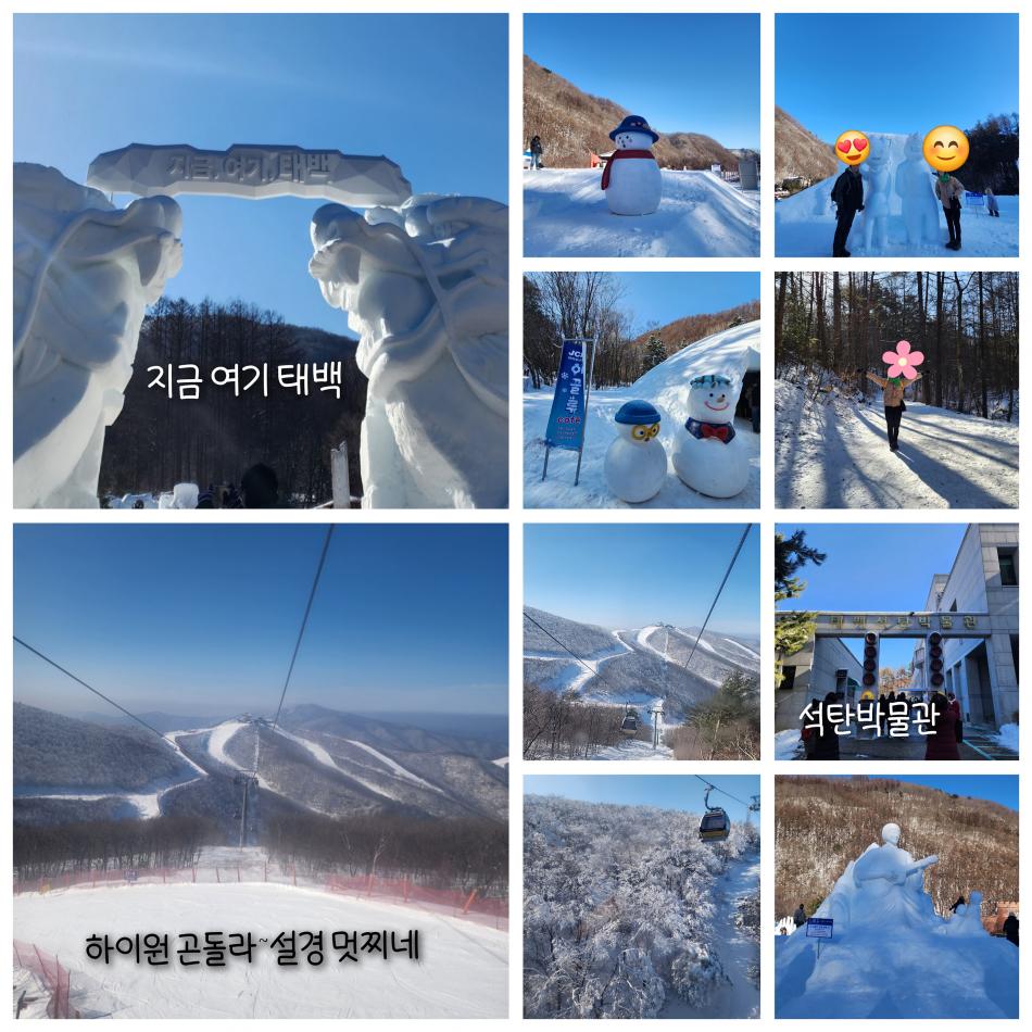 태백산눈축제&하이원곤돌라로 당첨^^ 눈구경할 생각에 설레이는 마음을안고 부부는 강원도로 향한다. 홍민의 가이드님의 밝은모습의안내를 받고 출발~~! 강원도가 가까워질수록 차 창밖으로 쌓인눈이 우리를 맞이하고 오랜 여정끝에 태백산 눈축제장에 도착~~~ 생각보다 눈이 많이 내렸던듯하다. 조각공원에 들어서니 웅장하고 아름다운 눈조각들이 우리를 반겨주고 어쩜저리 정교하게 눈으로 조각했을까 감탄하며 뽀드득 눈밟는 소리를 느끼며 행사장 여기저기를 누비고다녔다 ㅎㅎ 이글루카페도 이색적이었고 눈쌓인 숲속을 거닐며 사진도찍고 소풍온 아이처럼 즐거운 시간을 보냈다. 석탄박물관도 한번쯤은 가보면 좋을 장소인거같다. 볼거리가 엄청 풍부하고 마지막 엘리베이터 타고 갱도 체험하는게 하일라이트~~ 그렇게 태백산 여정을 마치고 하이원곤돌라 타러 고고~~!! 여지껏 타본 곤돌라중 가장 오랜시간을 탑승한거 같다. 설경이 너무 아름다워서 감탄에 감탄을하며 정상에 도착하니 스키나 보드를 즐기는 사람들도 엄청많았고 산 정상에서 감상하는 설경도 정말 멋졌다. 같은 나라에 이렇게나 다른 설국이 펼쳐진다는게 신기했다. 시간 가는줄 모르고 즐기다보니 출발시간이 되간다. 다시 일상으로 돌아가기위해 대구로 출발~~ 긴시간 안전운전해 주신 기사님과 즐거운 여행을 위해 애써주신 홍민의 가이드님께 감사드리며 다음에도 대구여행자클럽과 함께할 여행을 기대하며 하루를 마무리한다. 우리 부부의 추억이 이렇게 한 페이지더 쌓여간다^^ |
