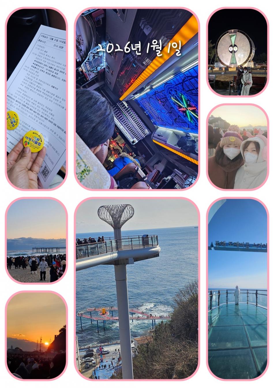 해가 뜨기까지 시간이 남아 추위를 피해 커피숍에 들렀다. 따뜻한 차를 마시며 잠시 쉬다 보니, 낯선 공간이라는 것도 잊은 채 평생 처음으로 조심스레 쪽잠을 청하게 되었다. 짧은 잠이었지만, 그 순간이 오히려 마음을 편안하게 만들어주었다. 이내 많은 사람들이 바닷가에 모였고, 나도 그들 사이에 서 있었다. 차가운 바람 속에서 새해 첫 해가 천천히 모습을 드러냈다. 떠오르는 해를 바라보며 말없이 소원을 빌었다. 그저 평범하지만 소중한 바람들이 새해에는 조금 더 가까이 다가오기를, 조용히 마음속으로 되뇌었다. 해돋이의 여운을 간직한 채 우리는 묵호항으로 이동했다. 따뜻한 아침을 먹고, 도째비 스카이워크에 올라 다시 바다를 바라보았다. 끝없이 펼쳐진 바다는 말없이도 충분히 아름다웠고, 그 풍경 속에서 여행은 자연스럽게 마무리되었다. 크지 않은 여행이었지만, 마음 한켠에 잔잔한 흔적을 남긴 새해의 시작이었다. 이모든게 대구여행자클럽이 있었기에 가능했고, 친절함등등 어느하나 빠지지않은 멋진 박도현 가이드님이 ^^계셨기에 이 여행이 더 특별하고 좋았습니다. 특히 목소리가 너무 멋진 박도현가이드님은 코로나전 경복궁에서 첫 만남^^으로 시작하고, 작년 추석 독일마을(비가 왜그리오는 날이였는지)~그리고 2026년 새해 정동진^^곧 다가올 무주여행까지^^ 인연이내요^^ 무주여행때도 잘 부탁드립니다.^^ 참 그리고 버스가 너무 신식이여서 깜놀^^ 기사님역시 너무 너무 감사드려요 (참고로 함께한 우리 언니는 이런여행 처음이여서 머리위 노랑마크^^를 저렇게하면서 종일 다녔으며^^ 집에까지 가셨어요^^ ) |