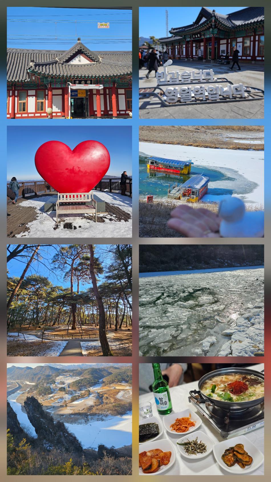 눈보기 힘든겨울 대구에서 하얀 겨울왕국이 보고싶어 검색하다 우연히 본 대구여행자클럽에 당일 하이원여행!! 사실 강원도는 자차 운전으로 당일치기는 너무 무리이고 아침에 출발해서 하루 동안 그렇게 많은 곳을 갈 수 있다는 놀라운 경험과 강원도까지 가는 내내 잠도 자고 서강 따라 흐르는 영월 선돌에 도착하니 웅장함에 놀랍고 청룡포에 가서 나룻배를 타고 단종인 지냈던 유배지 흔적을 보니 감회가 새롭고 600년 넘은 관음송 소나무는 할 말을 잃게 만들었습니다. 강원도 영월역에서 맛있는 두부전골에 반주까지 ~(운전안하는 덕분에 누릴수 있는 호사) 다음은 축제 여행을 예약해 볼까 합니다. 왜 이제야 알게된건지 .. ^^ |