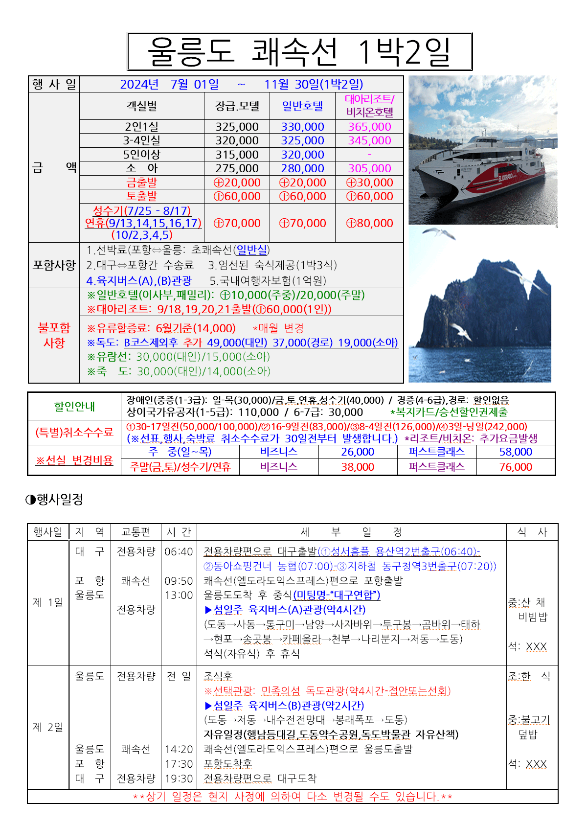 대구⇔포항 왕복수송비, 포항⇔울릉 왕복선박비[선박 단체 일반석], 식사 1박3식, 울릉도관광(육로일주버스투어A코스+동쪽일주버스투어B코스), 여행자보험