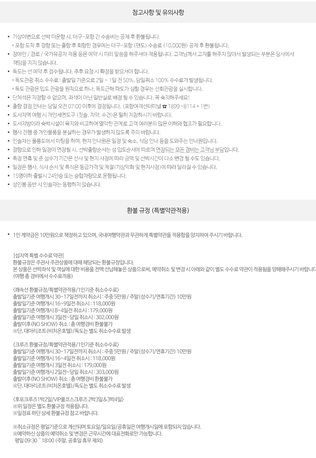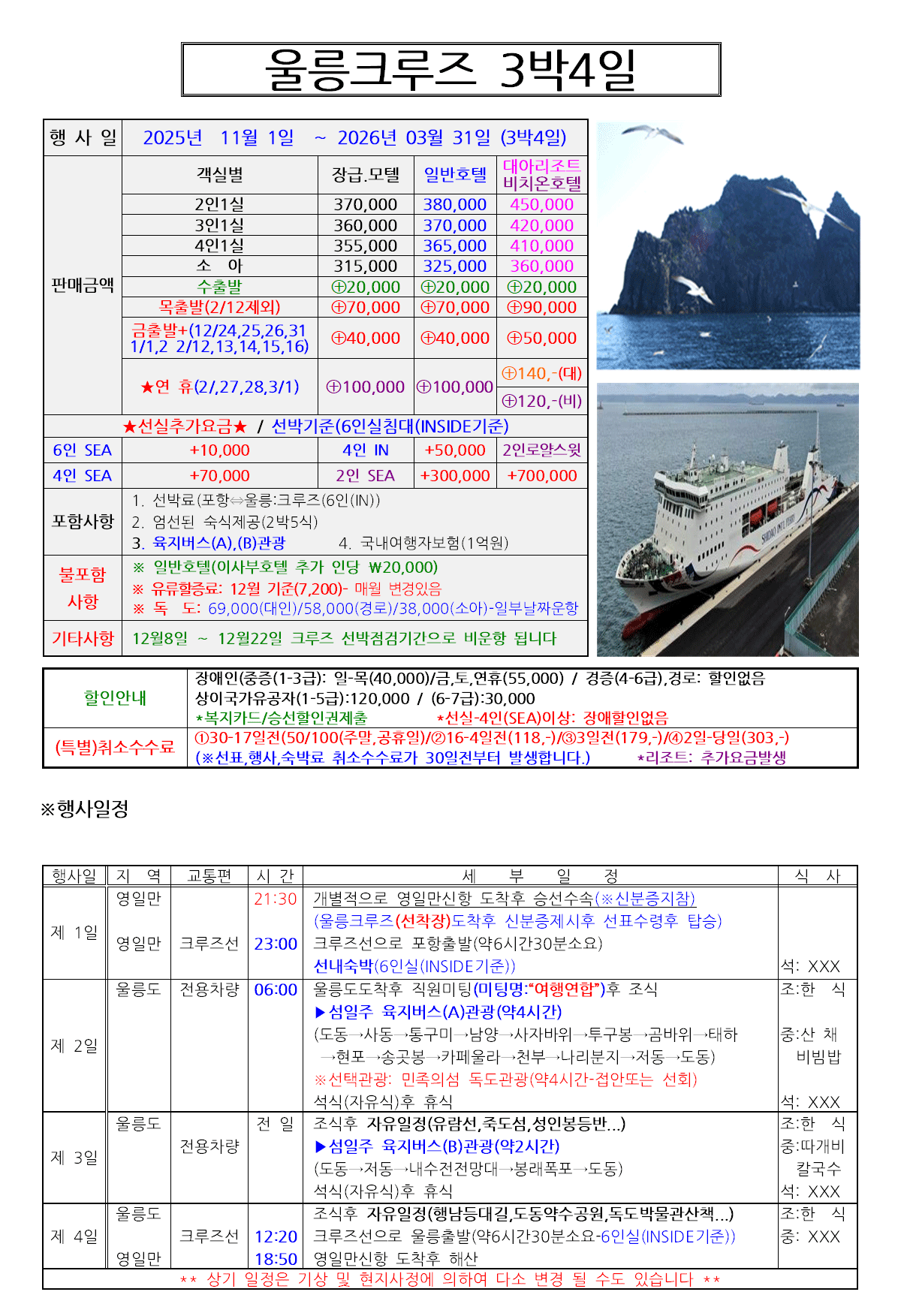 1. -20,000할인 2. 독도 50%할인(33,000) 3. 대아리조트 예약시 셔틀무료(40,000)