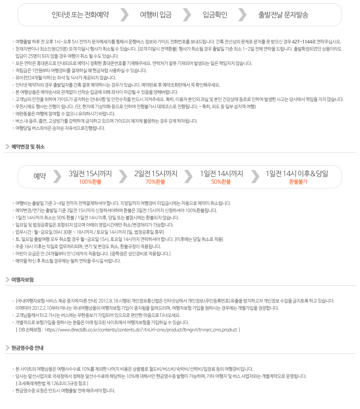 고객께서 예약하신 사항(출발일자/요일/행선지등)은 출발하루전 문자로 일괄 발송하니, 본인의 예약사항이 틀릴 경우 바로 연락 부탁드립니다. (혹, 여행출발 후 연락시 당일취소로 처리 됩니다)