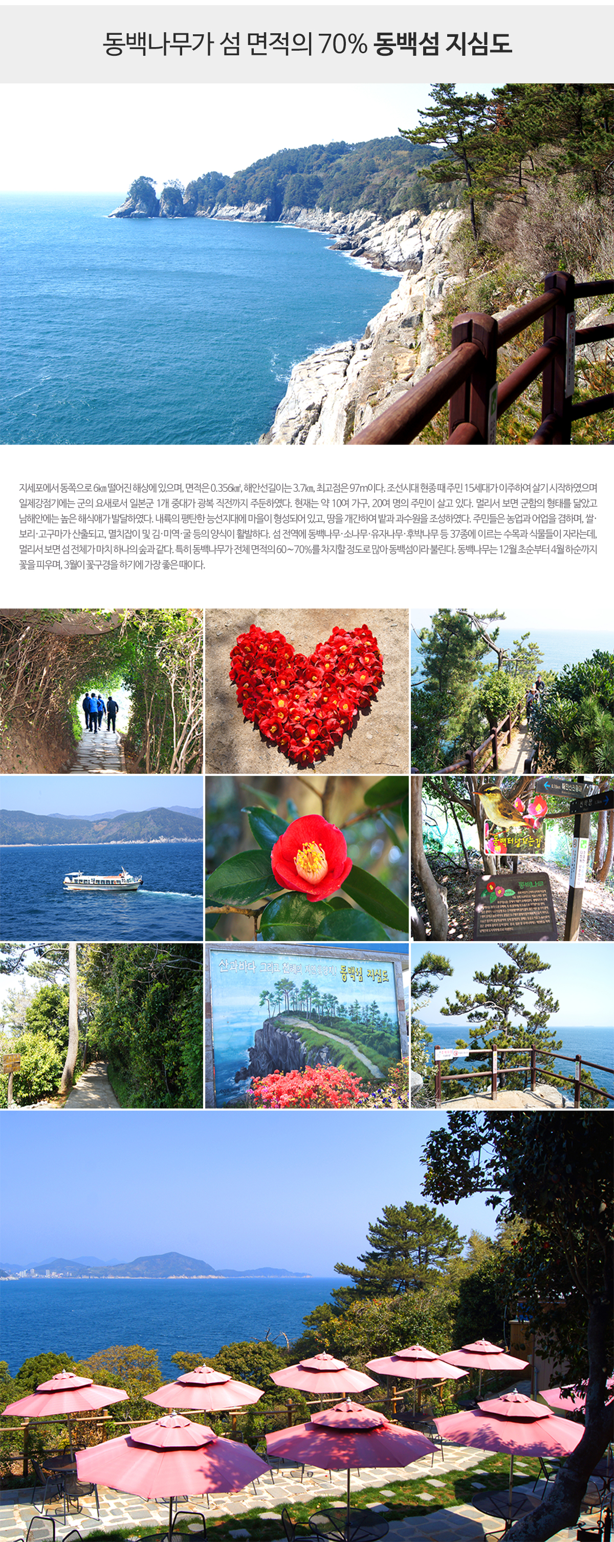 - 남해안 섬 중에서 어느곳보다 동백나무의 수가 많아 동백섬이란 이름이 가장 잘 어울리는 섬