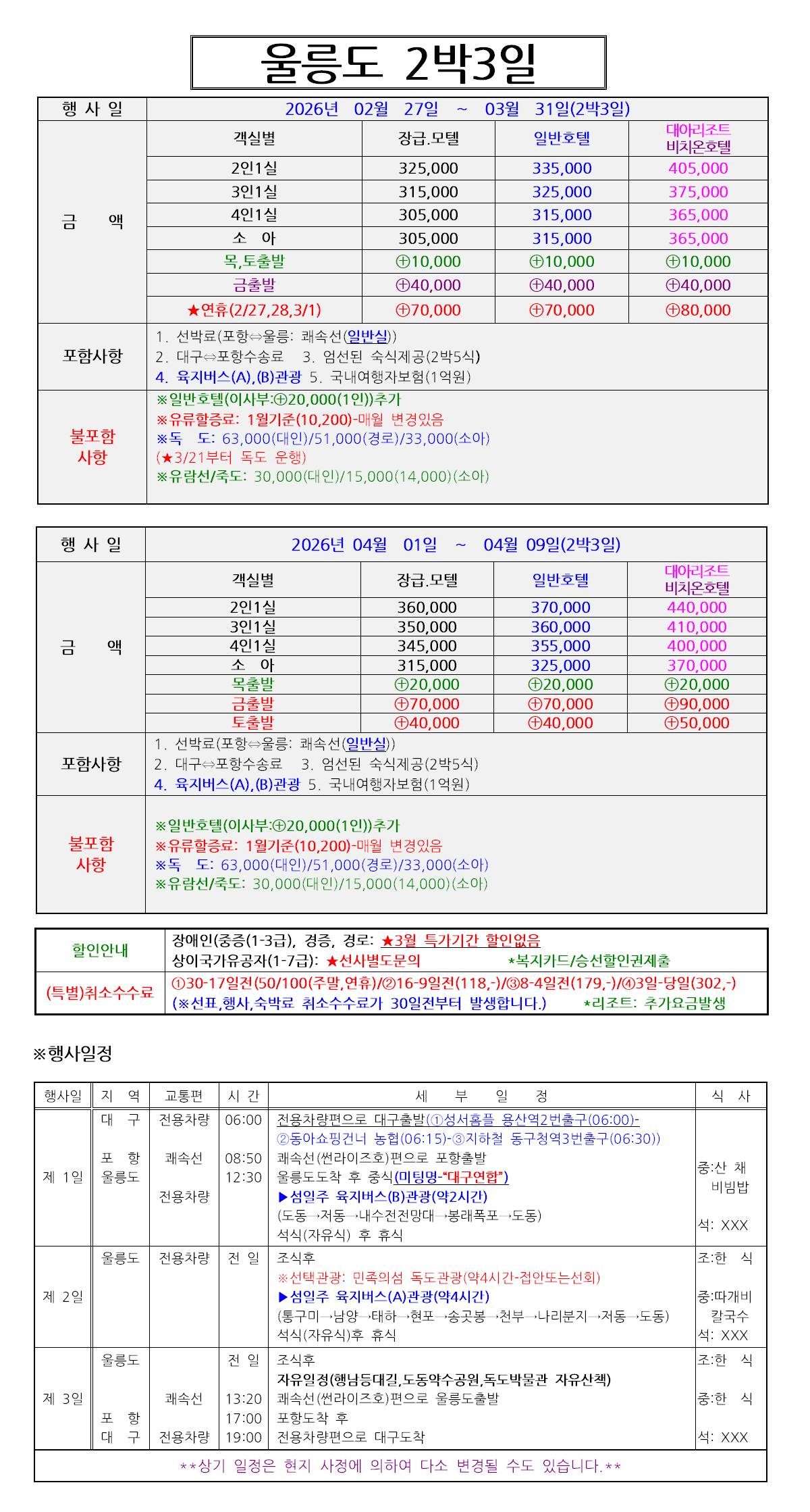 [매일출발] 울릉도&독도 3월특가 쾌속선 2박3일
