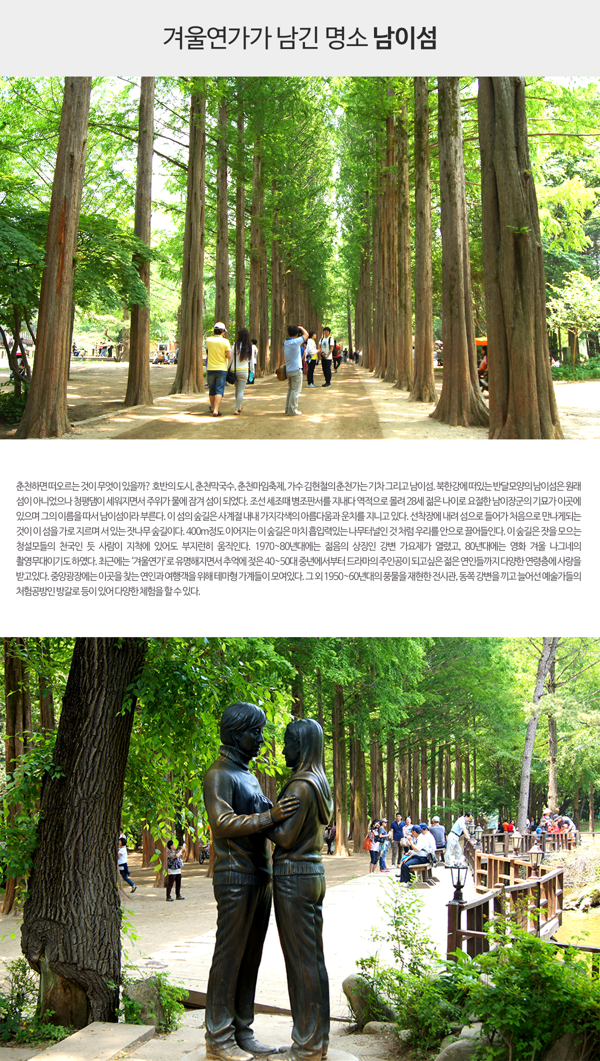 - 메타세콰이어길, 은행나무길, 꼬마열차, 겨울연가 첫키스 장소등이 있습니다.