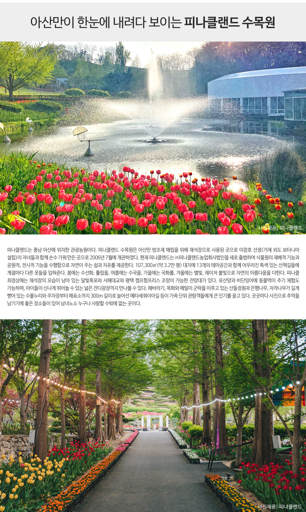 - 봄에는 수선화/튤립, 여름에는 수국, 가을에는 국화, 겨울에는 별빛등 4계절 자연의 아름다움을 전하는 곳