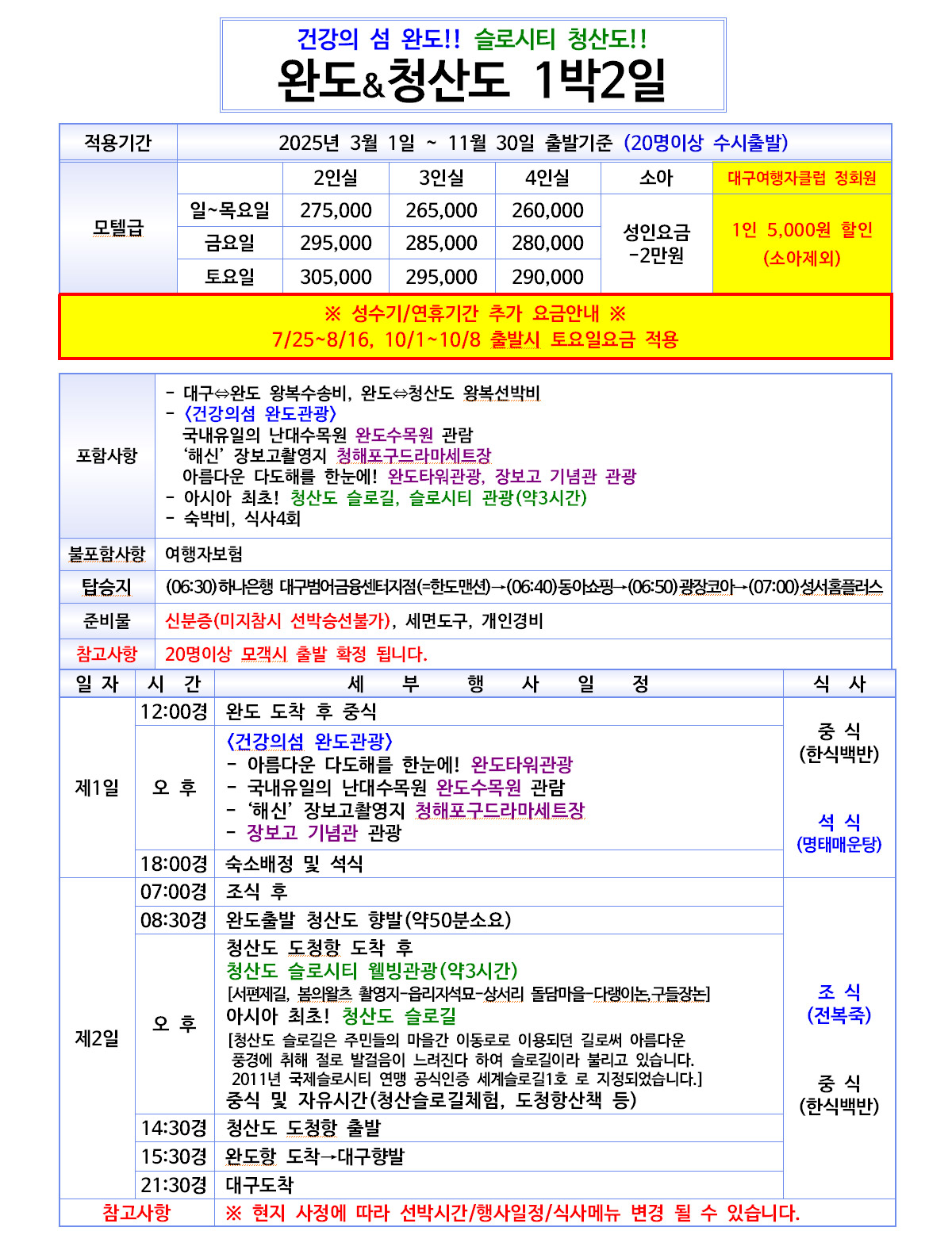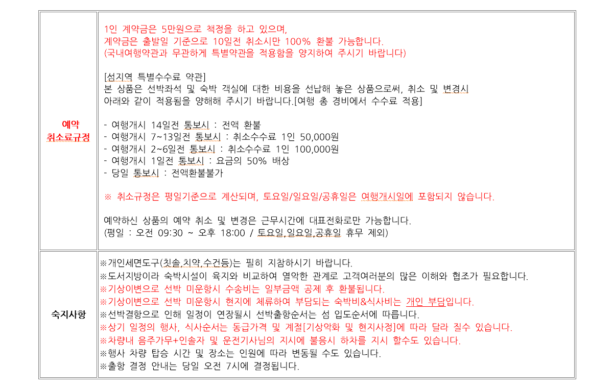 고객께서 예약하신 사항(출발일자/요일/행선지등)은 출발하루전 문자로 일괄 발송하니, 본인의 예약사항이 틀릴 경우 바로 연락 부탁드립니다. (혹, 여행출발 후 연락시 당일취소로 처리 됩니다)