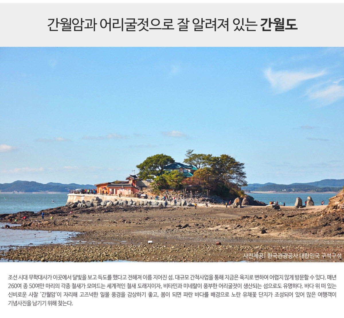 - 대규모 간척사업을 통해 지금은 육지로 변하여 어렵지 않게 방문할수 있습니다.